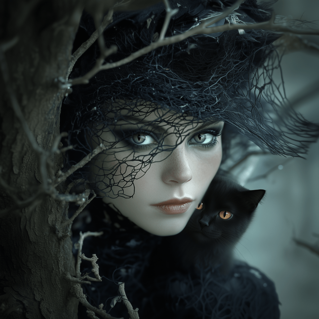 A closeup portrait of a woman who is part cat, with realistic and detailed skin and fur, incorporating whimsical and surreal art styles, dark fantasy elements, dramatic lighting effects, and an ethereal atmosphere. The character should have expressive eyes, a unique hairstyle, and be surrounded by a haunted and mysterious misty forest with ancient trees that blends realism with vintage elements and impressionist influences. –ar 1:1 –c 25 –s 250 –v 6.1 –style raw