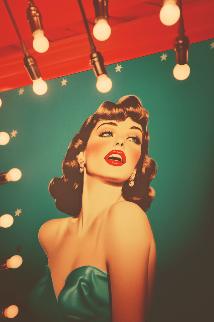 a closeup of a 1940s illustration, las vegas stage, silkscreen style, 7 colours, image prompt –ar 2:3 –personalize s2myfgv –stylize 250 –style raw –v 6.1