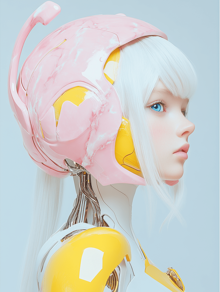 a closeup portrait of a paste pink and yellow marble helmet, robotic, white haired girl, blue eyes, baroque, upper body, cinematic, castle background,