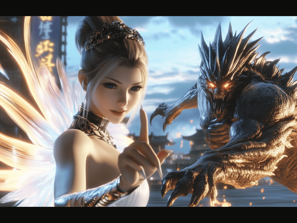 a closeup of a scene from the massively multiplayer online computer game Final Fantasy XIV with a female Miqo’te dancer in a feathery soft semitranslucent dress holding her signature post of victory, a dead gigantic mythical monster lies smoldering behind her –ar 4:3 –style raw –c 20 –weird 75 –v 6.1