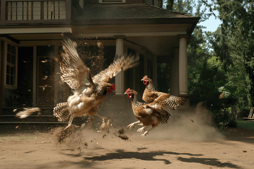 Three French hens squawking and fighting in the backyard garden of a palatial Victoria country estate, tufts of feathers floating above and piled on the ground –ar 3:2 –style raw –c 30 –s 50 –v 6.1
