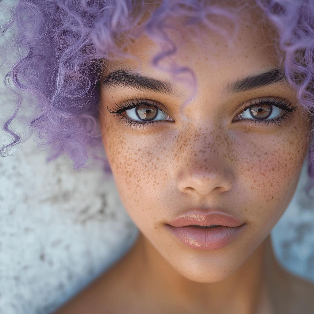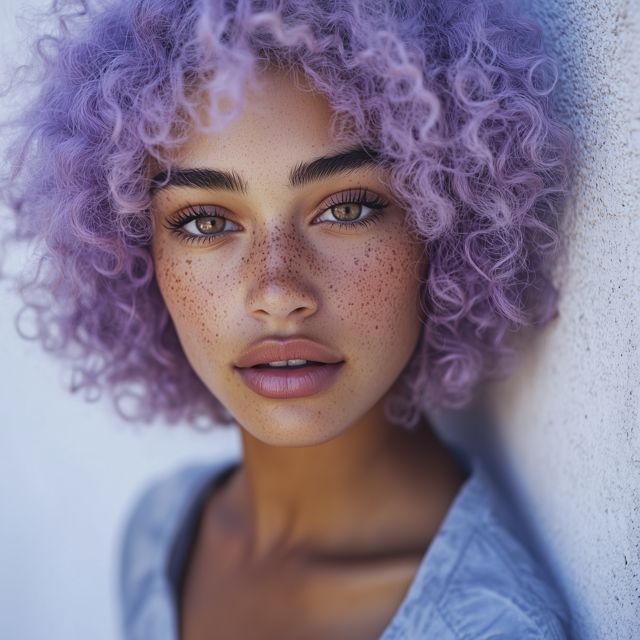 closeup of a freckled twenty-year-old mulatto female with curly light purple hair looking directly at the camera in front of a pure white concrete wall with a neutral expression, portrait lens, professional portrait lighting, 49mm lens –style raw –ar 1:1 –c 10 –v 6.1