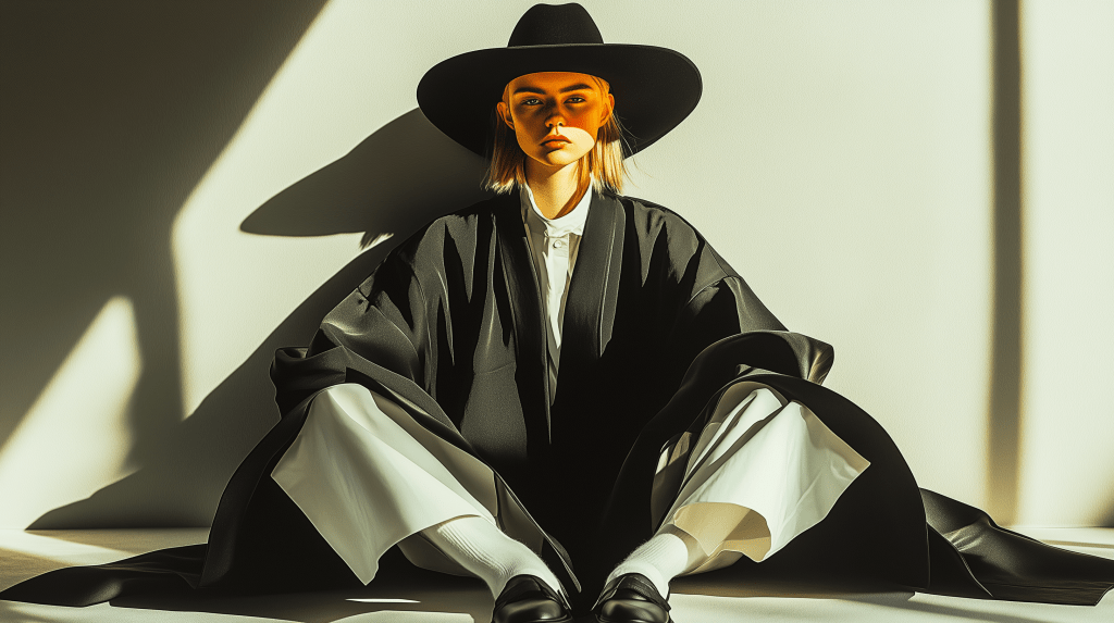a fashion photoshoot featuring a female model sitting confidently on the floor, the model is dressed in a stylish black and white suit with matching black hat, creating an androgynous and sophisticated look, she is wearing dark loafers with white socks, adding a subtle twist to the classic outfit, the lighting is but directional, casting shadows that emphasise the texture of the clothing and the contours of the model’s face, the background is minimalist, enchanting the focus on the model, her facial expression is confident and introspective, with dramatic makeup highlighting her eyes, the overall mood is elegant, minimalistic, and fashion-forward –ar 16:9 –p ttzcnik –v 6.1