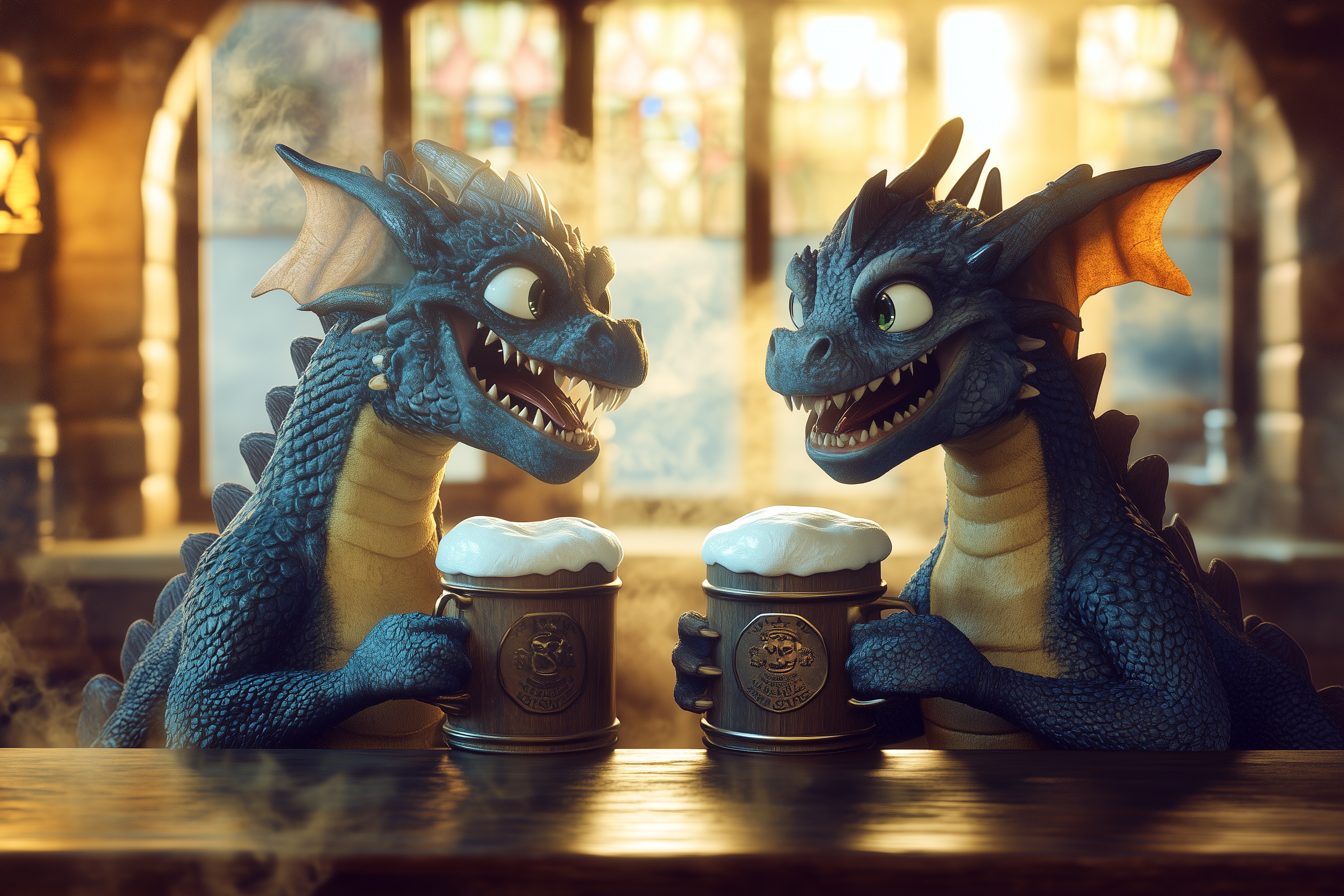 two hysterically laughing young dragons looking at each other in a medieval rustic tavern with steins of frosty beer in front of them, rays of light stream from the ceiling, stained glass windows are on the walls of the tavern, portrait 80mm lens, Tyndal lighting, smoke filters around the tavern adding a mystical feeling to the scene –ar 3:2 –c 5 –v 6.1