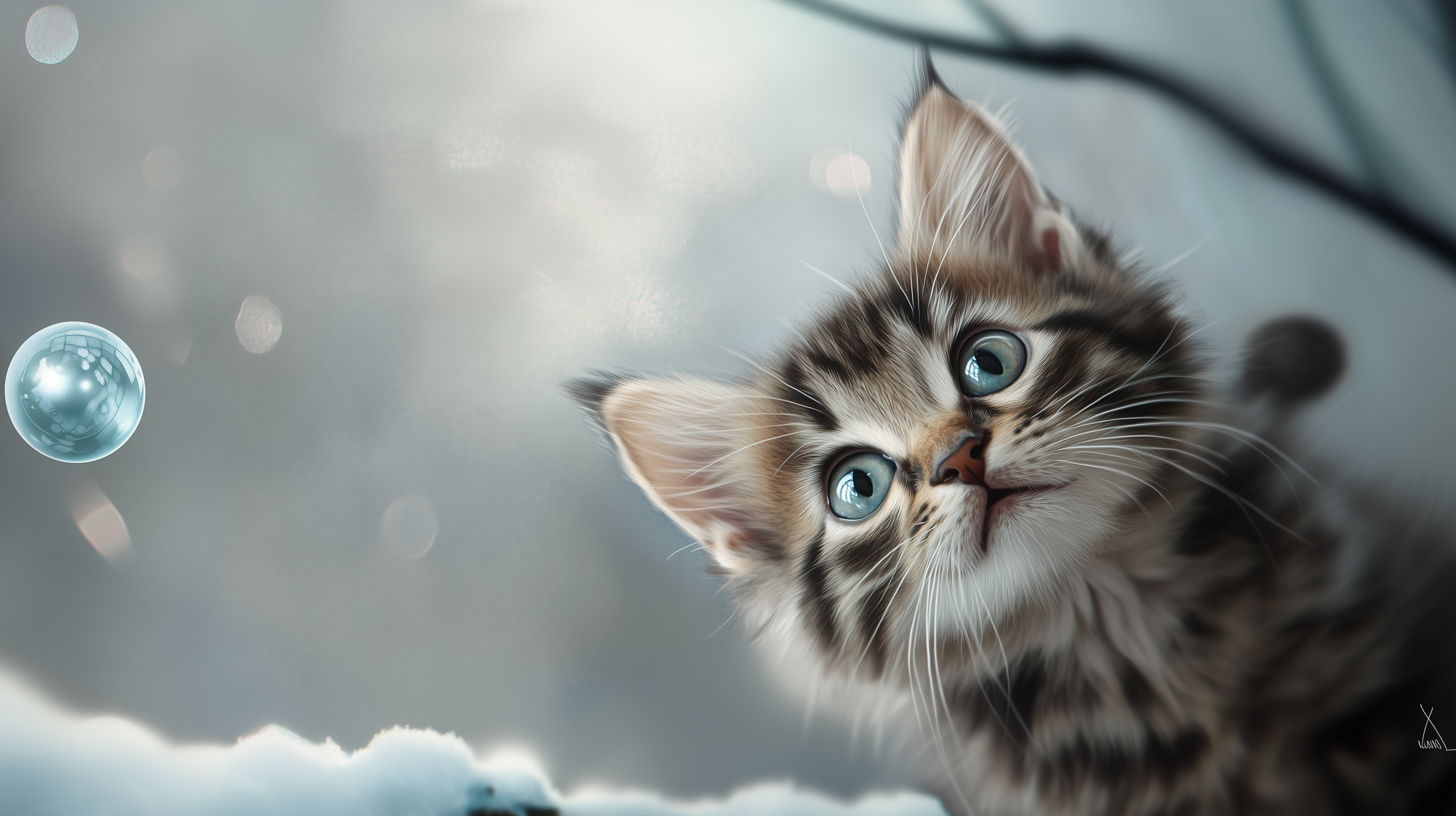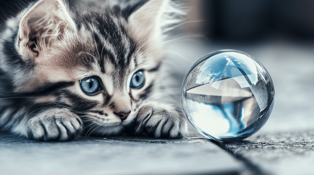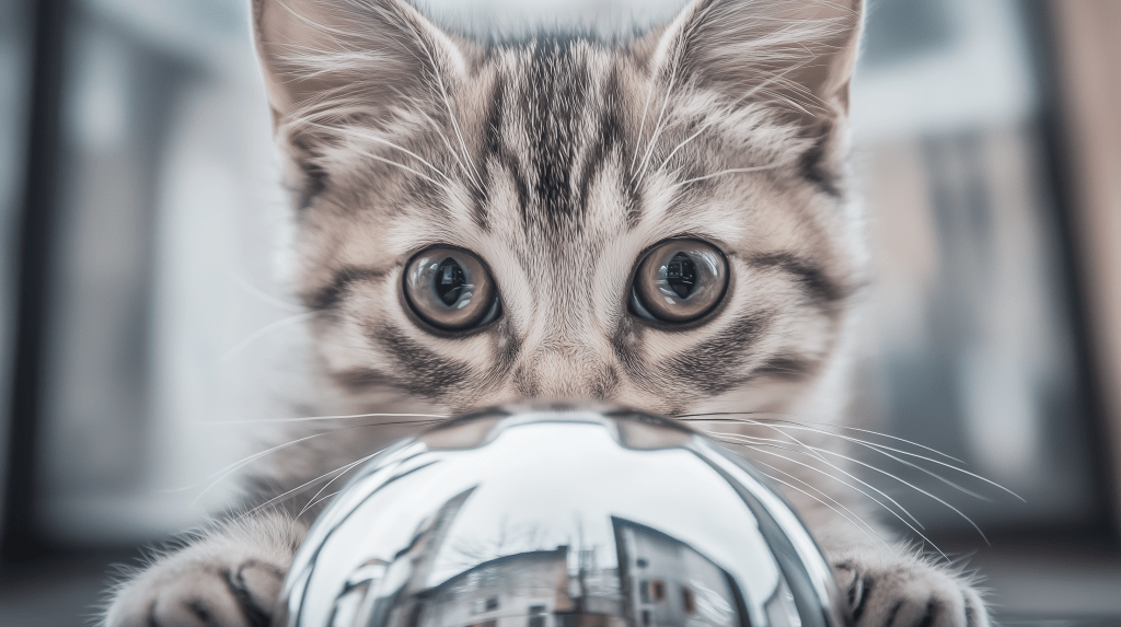 a closeup of a kitten looking at a mirror ball in the Kandinsky style, photorealistic, fish eye lens –c 10 –ar 16:9 –style raw –v 6.1 –p zy35zex
