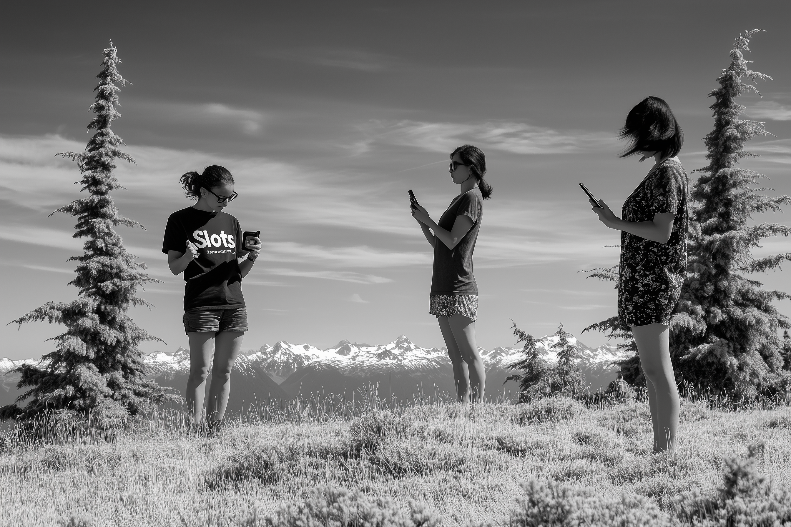 A black-and-white infrared photograph of three people standing on a grassy hill at the top of Grouse Mountain north of Vancouver British Columbia. One person is wearing a “Slots” t-shirt while throwing a frisbee to another who has short hair and bangs and is wearing glasses with thin-rimmed lenses. The third person holds their phone up high as if taking pictures or recording them playing sports together. In the foreground are some tall trees, and in the background, you can see snow-capped mountains. The photograph was taken during daylight. –v 6.1 –p zy35zex –ar 128:85