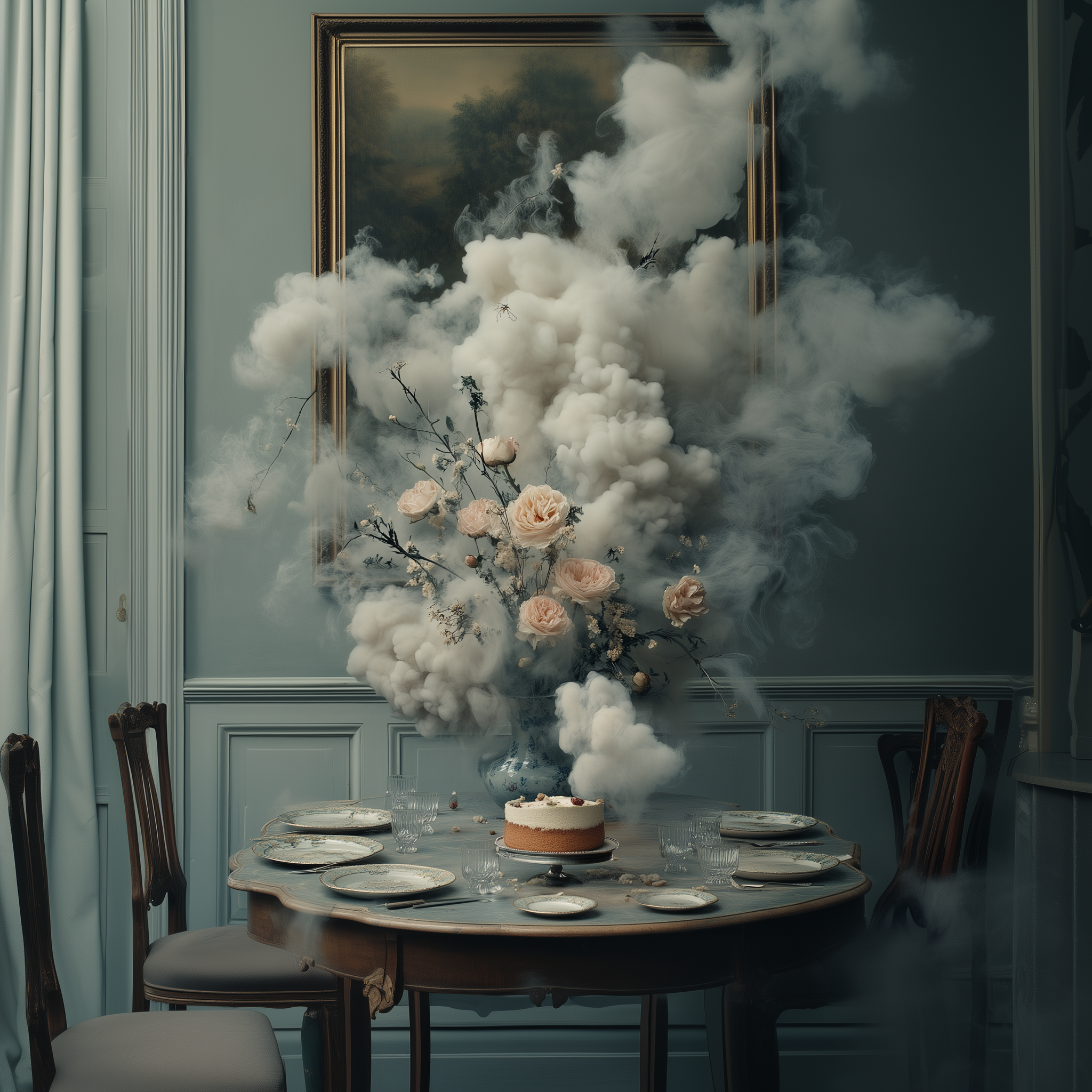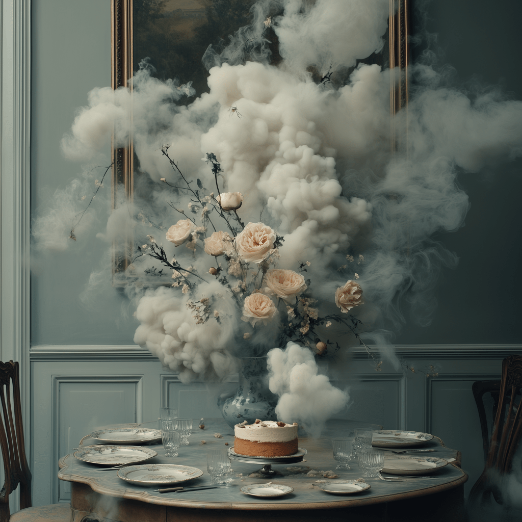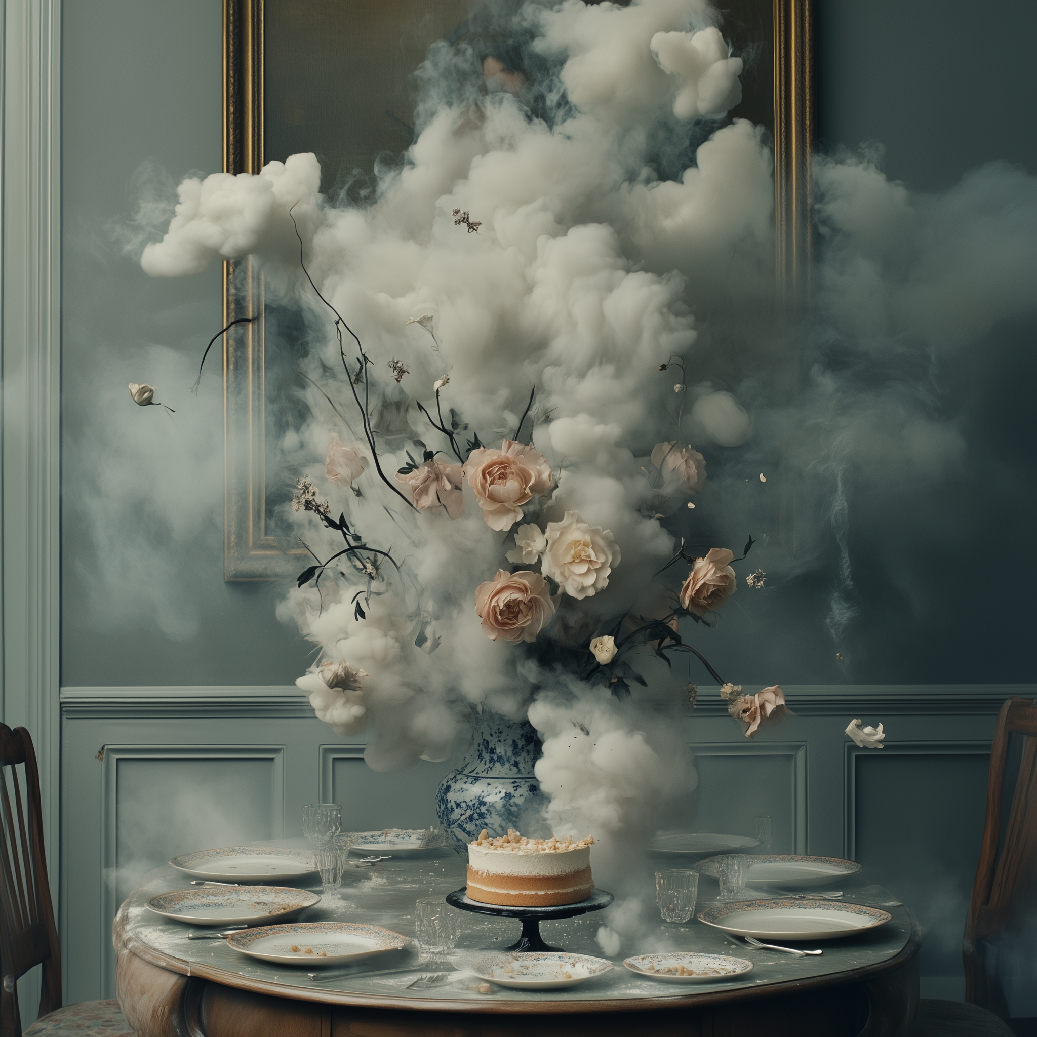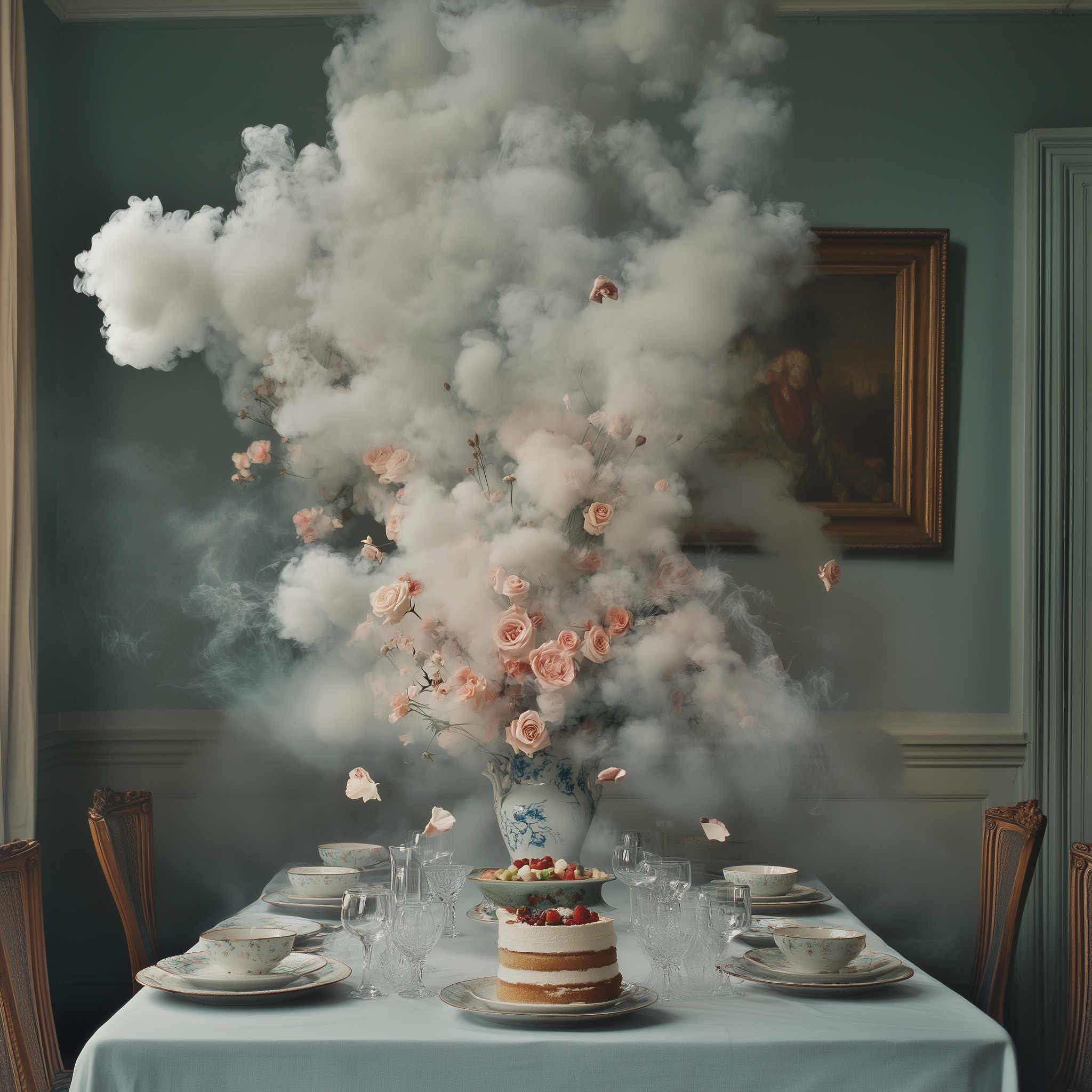 hd photograph of an exploding bouquet of flowers with puffs of smoke on a bombed formal dinner table, beautiful crockery and exploded opulent food and a devastated vase of flowers, cake and flower debris flying out of the scene, a large table is covered in plates of food, the scene is set in a formal dining room a painting hangs on one wall, there is also furniture in the room, the flower bouquet at the center –stylize 300 –ar 1:1 –v 6.1 –p zy35zex