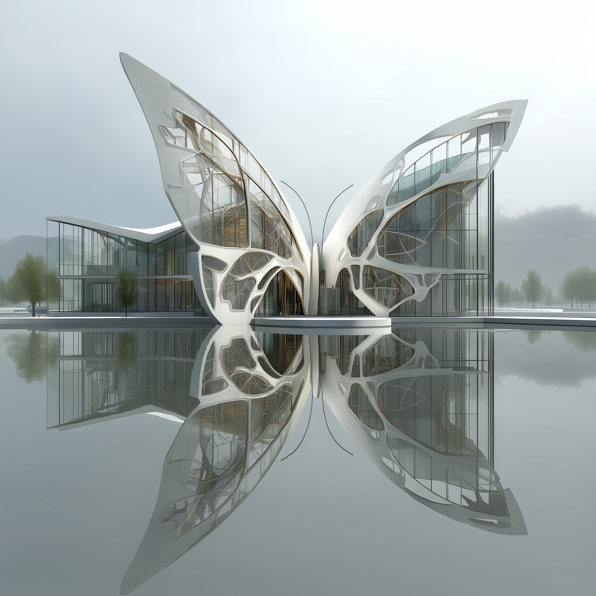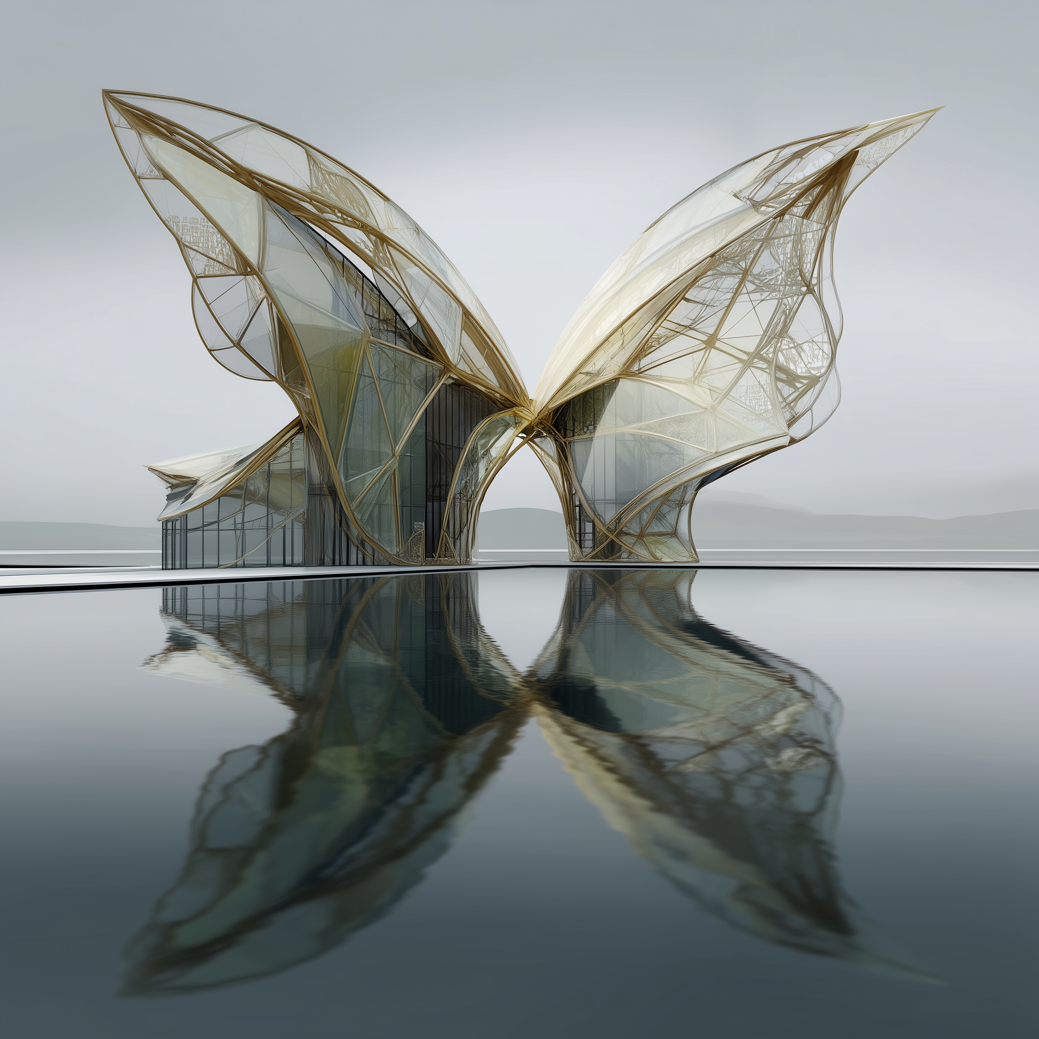 design a large futuristic building similar to a butterfly at night beside a major traffic intersection in a futuristic city –ar 1:1 –s 250 –v 7.0 –p okg484f