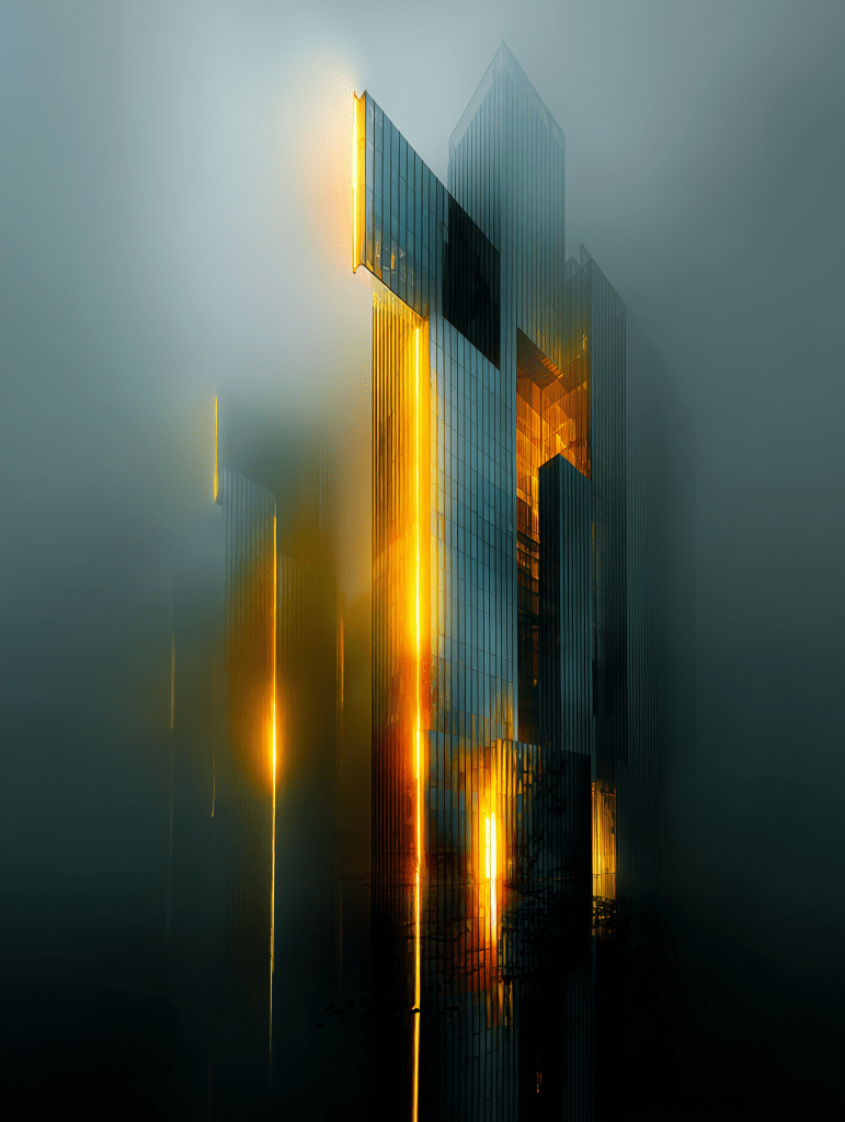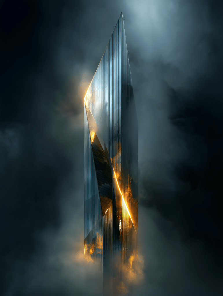 dark blue and yellow night, a tall skyscraper emerging from the clouds, futuristic building made of chrome and glass with vertical stripes, seen from above, in a foggy atmosphere, cinematic architecture photography, shot on a Nikon D850 –ar 3:4 –s 250 –v 7.0 –p okg484f