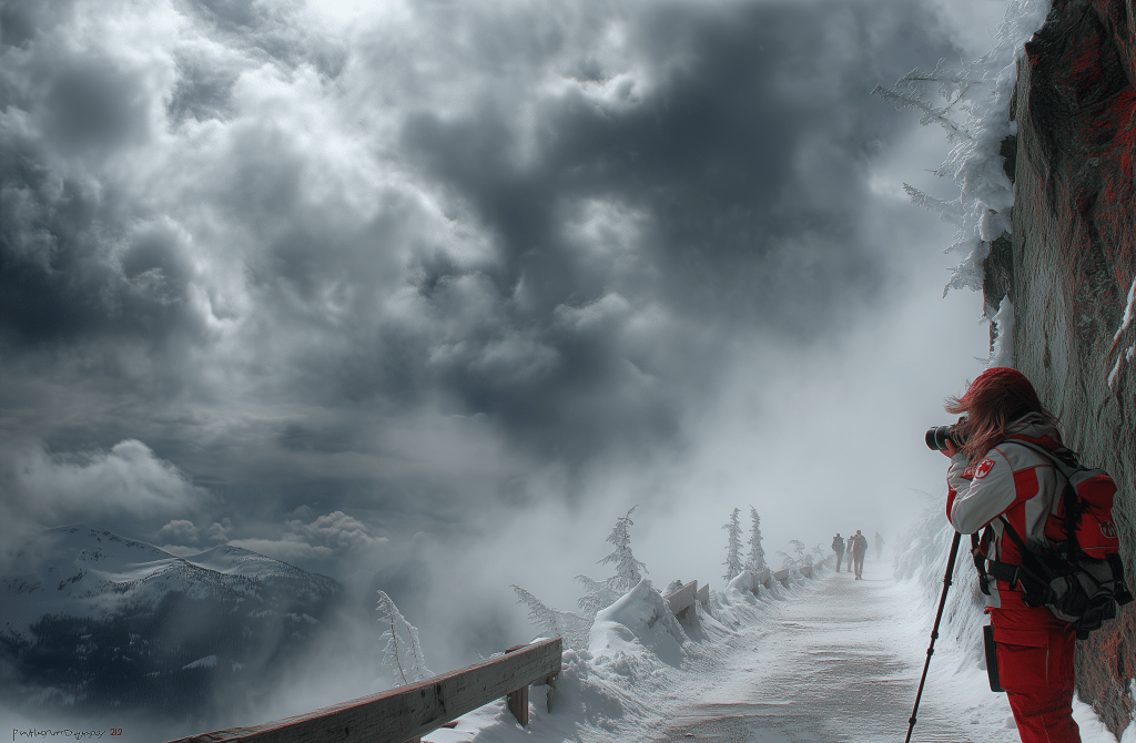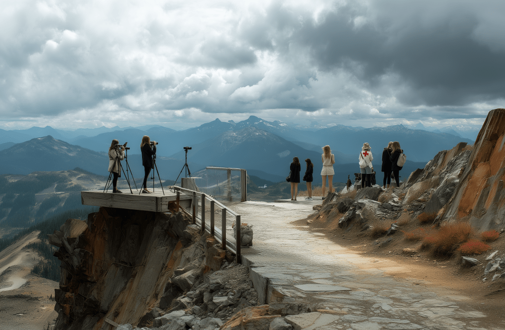 Shot four story: A social media influencer and her crew at the top (almost) of Whistler Mountain near Whistler, BC. Complete with video crew, first aid crew and BFFs.