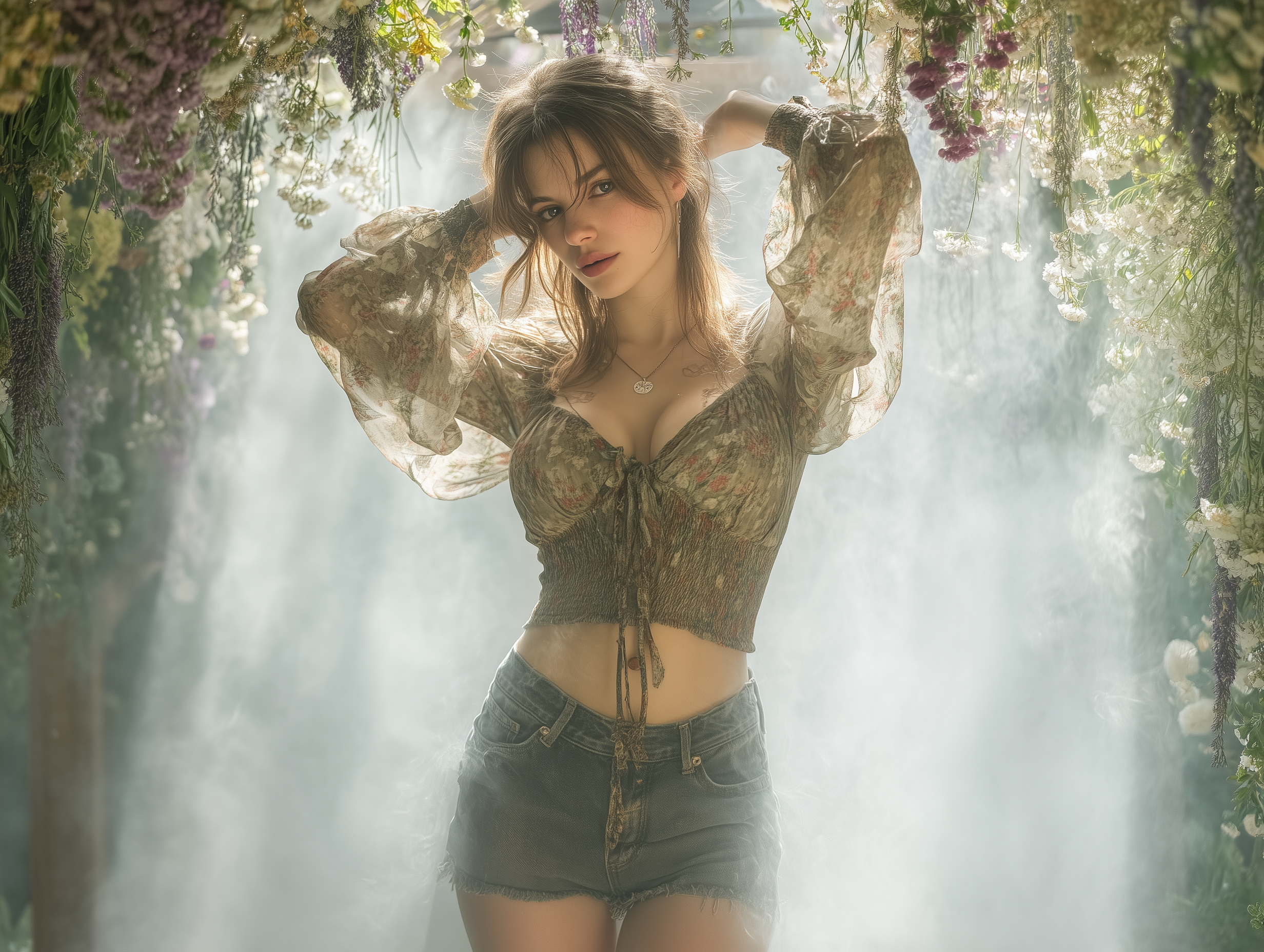 A full-body photograph of an attractive young woman with long brown hair, wearing denim shorts and a boho-style blouse, standing in a garden and dancing. The image is captured with natural lighting, highlighting the subject’s natural features. The photograph was taken using a Canon EOS R5 camera. –ar 4:3 –s 250 –v 7.0 –p okg484f