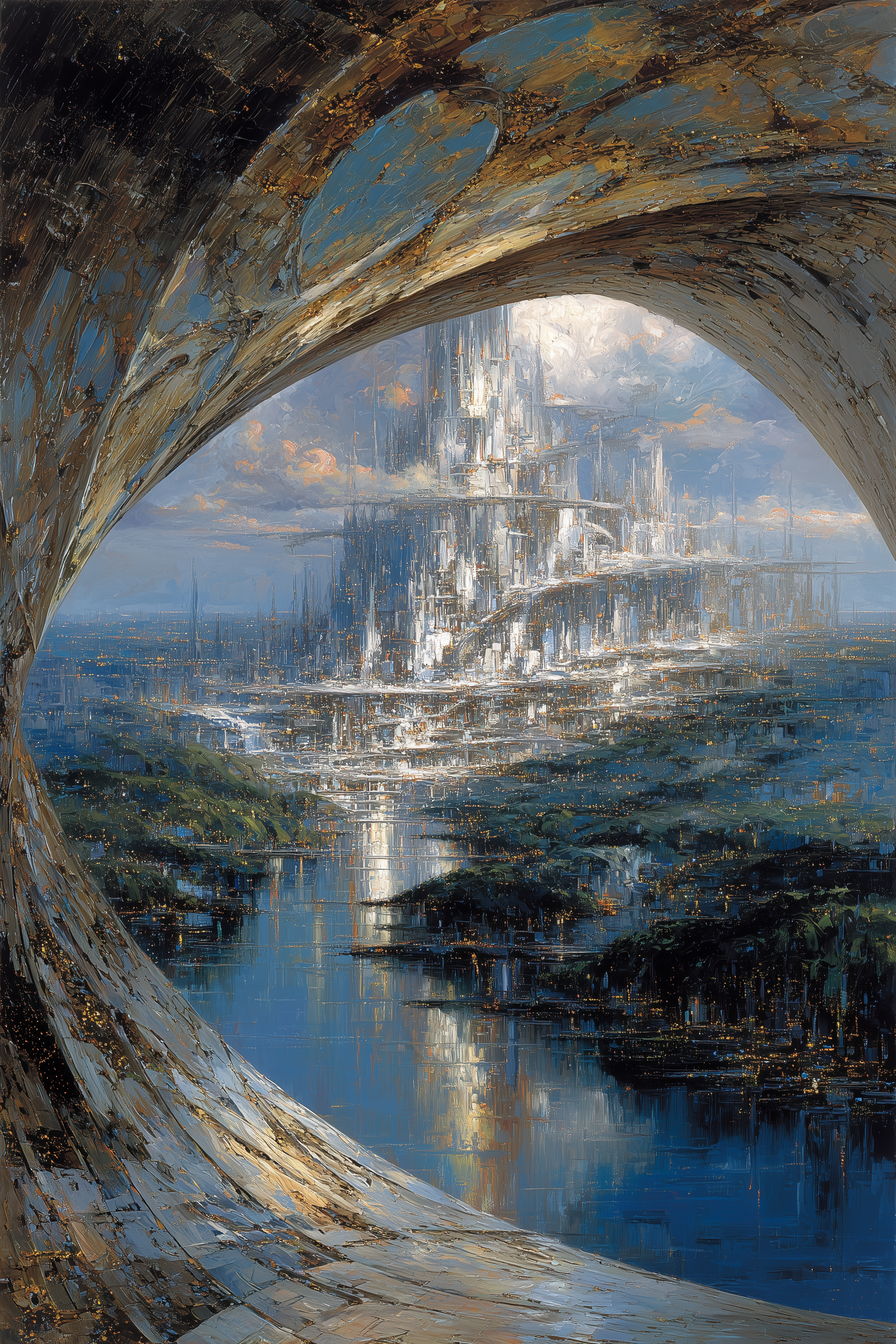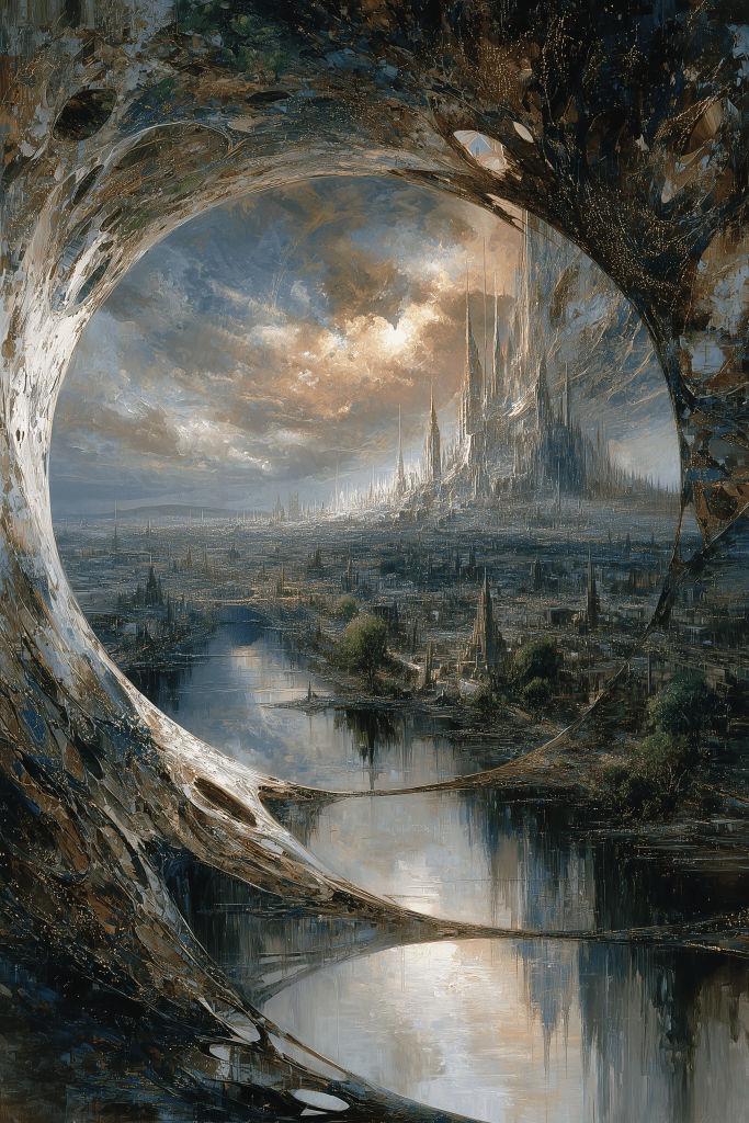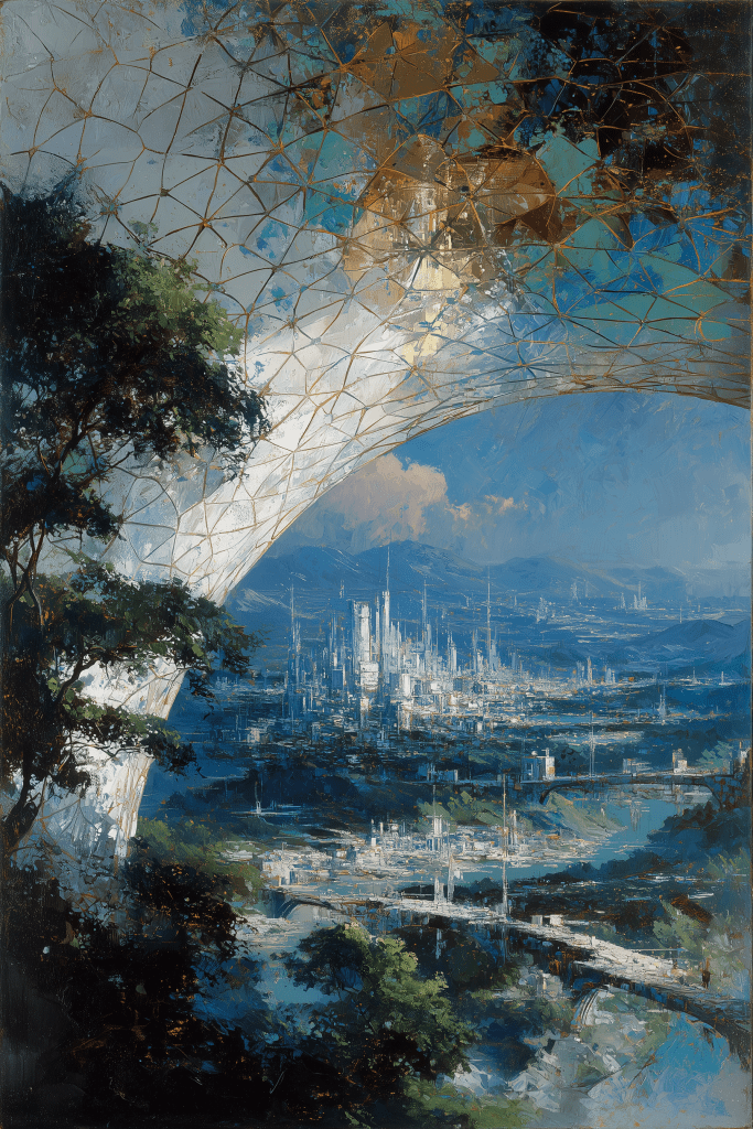 a view of a detailed futuristic city, pastel-like sunset palette, the scene is framed by an arched structure made of organic alien technology in the foreground, 1960s science fiction book cover art –ar 2:3 –exp 25 –raw –s 250 –v 7.0 –p okg484f