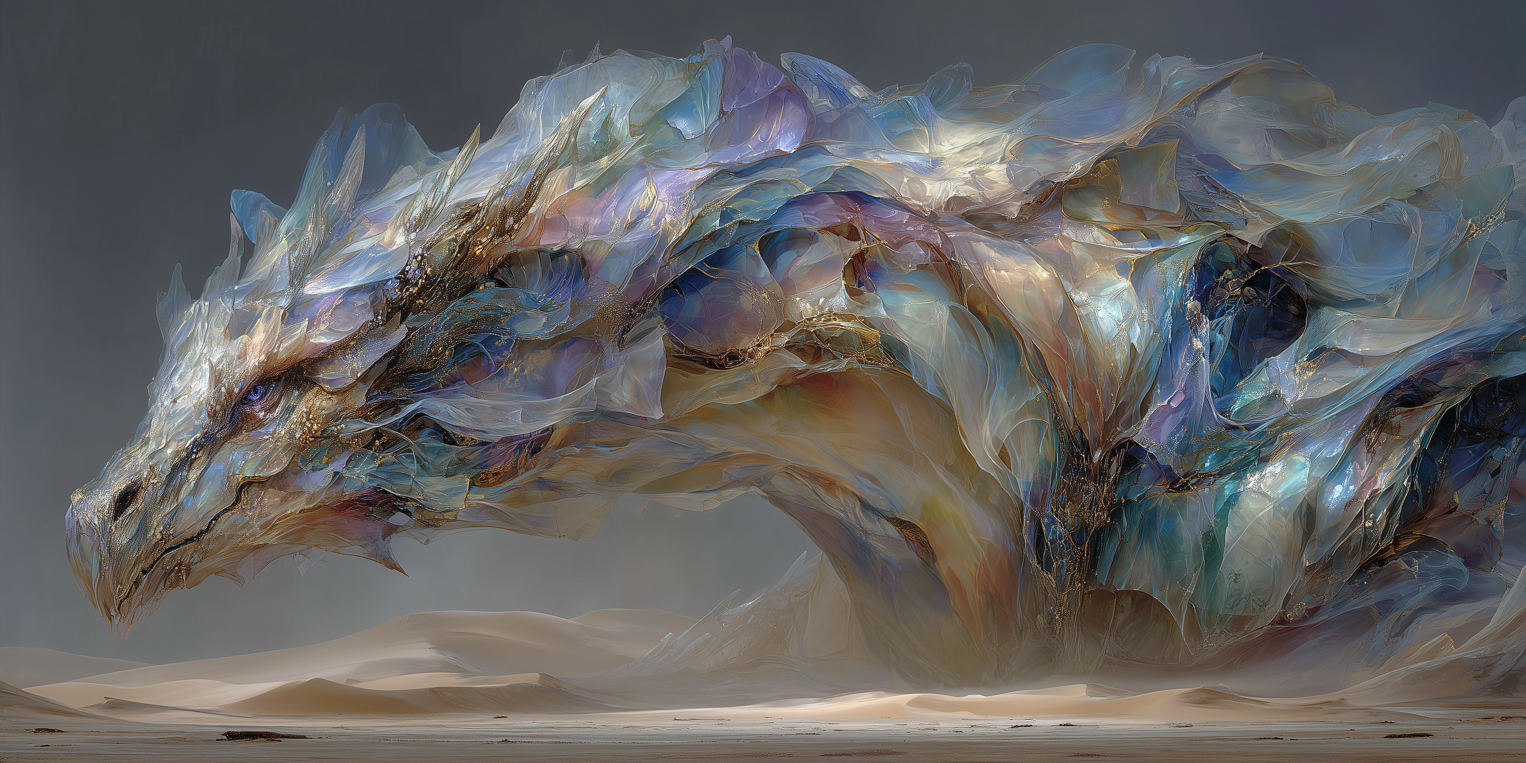 a Google Streetview, a gigantic dragon inspired by the empires of the reptiles by John Harris, vast dunes of flowing iridescent silk –exp 25 –s 250 –v 7.0 –p okg484f –ar 2:1