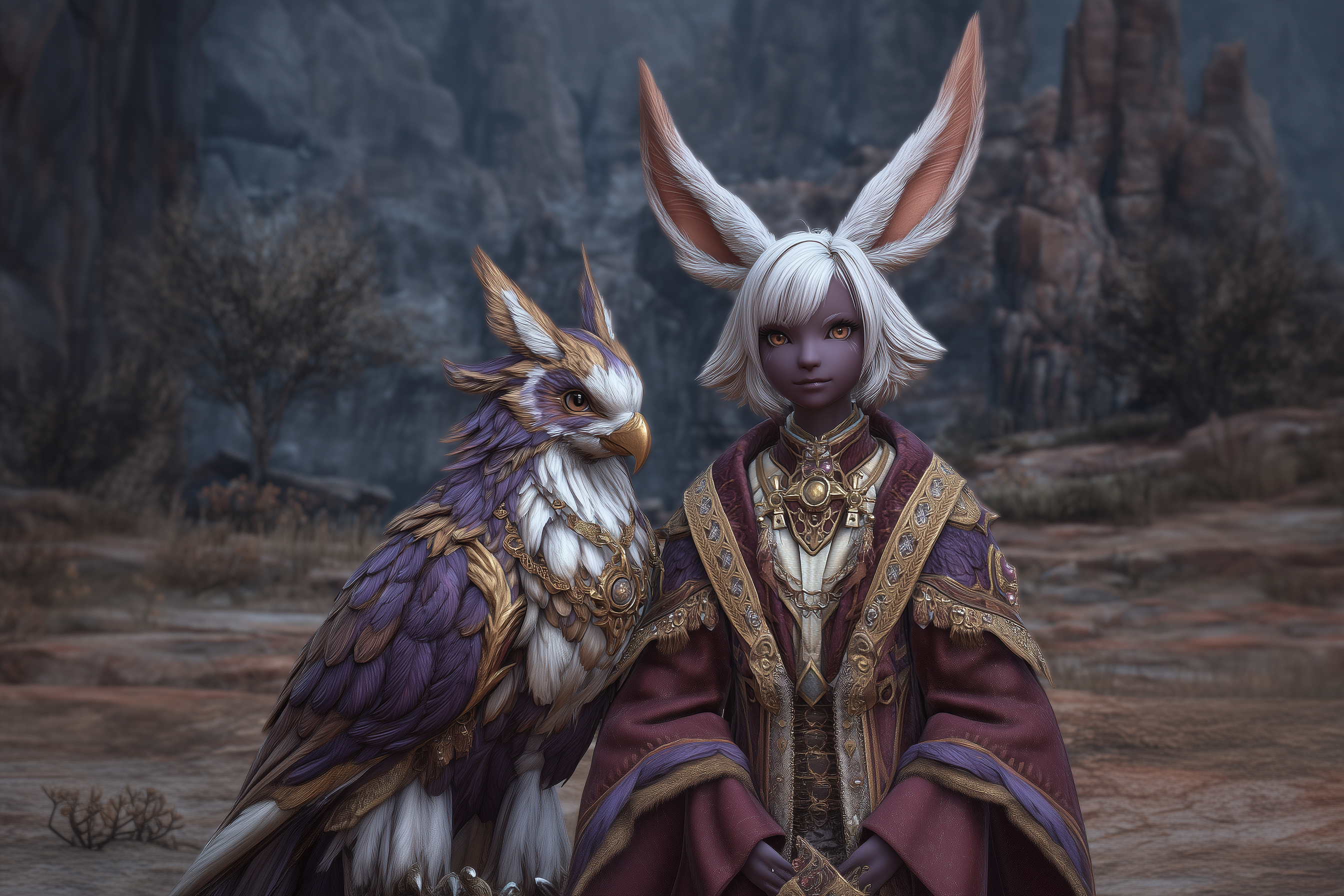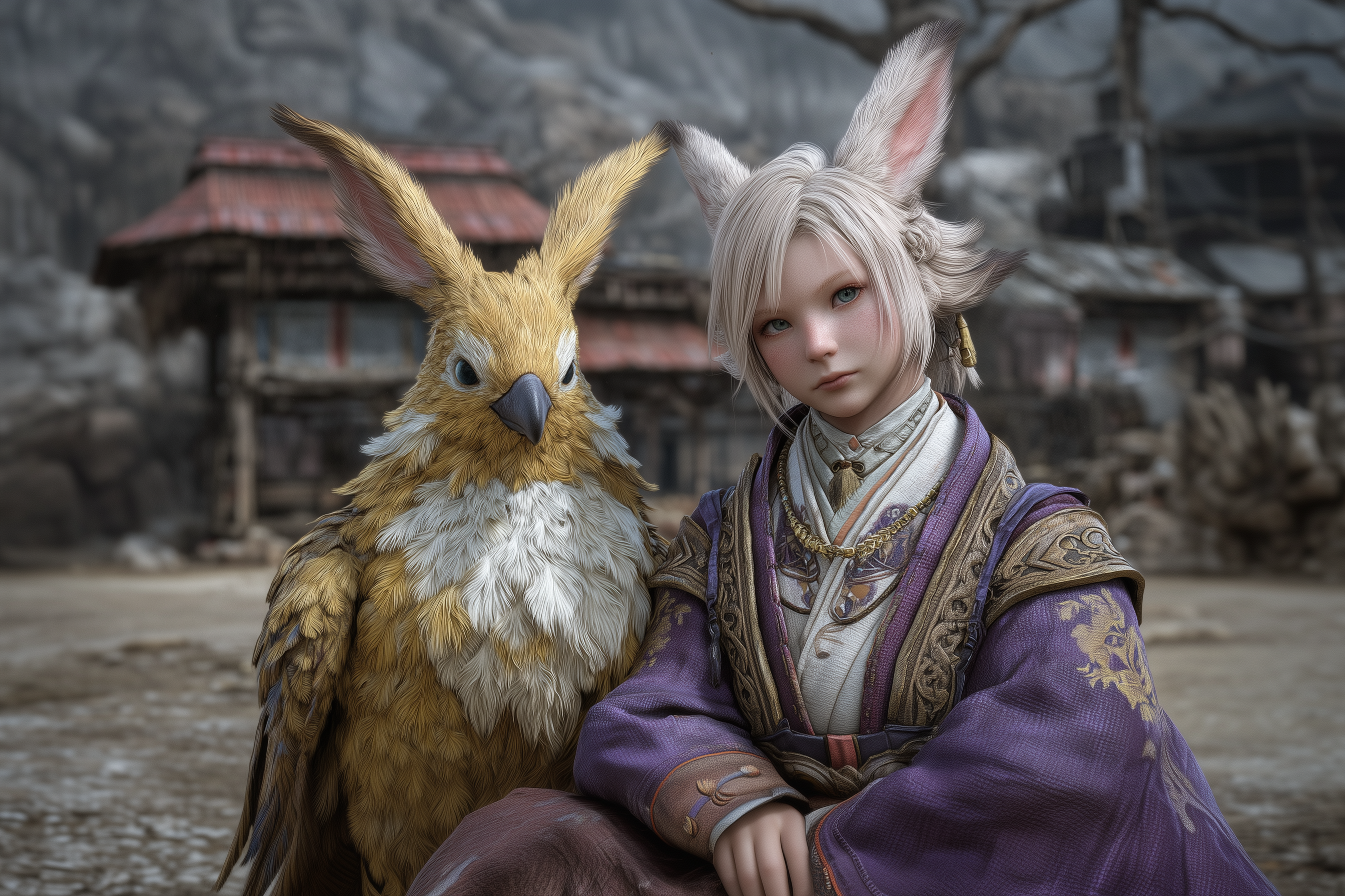 Screenshot from Final Fantasy XIV, a female Viera character with a purple and white outfit standing next to a yellow-brown Gafka, a phoenix-dragon hybrid creature, in the background on an ancient battlefield. –ar 3:2 –v 7.0 –exp 100 –raw