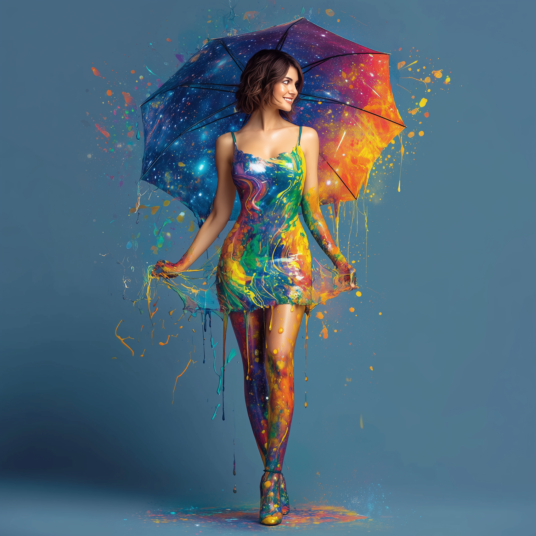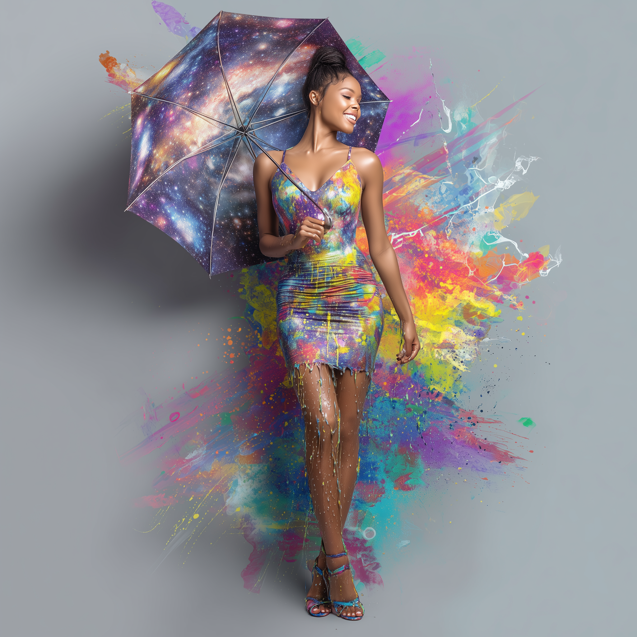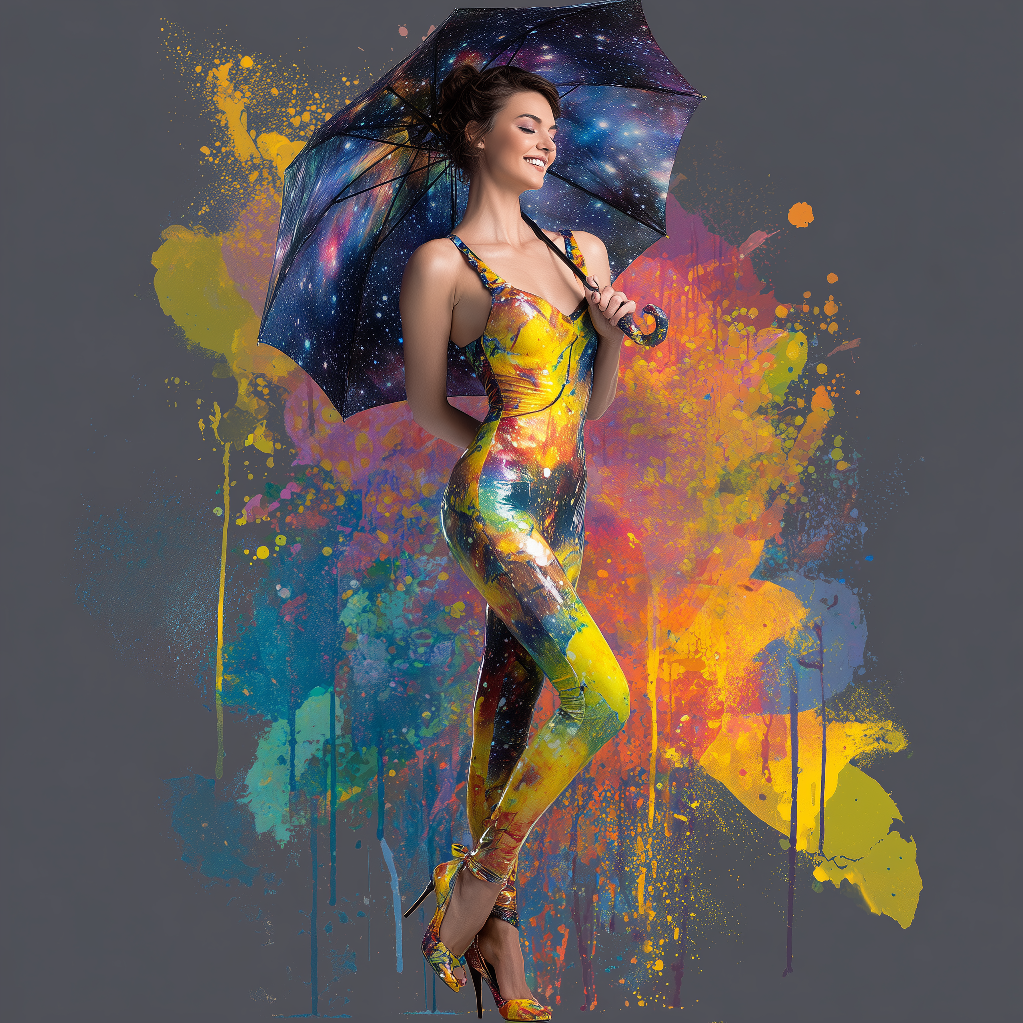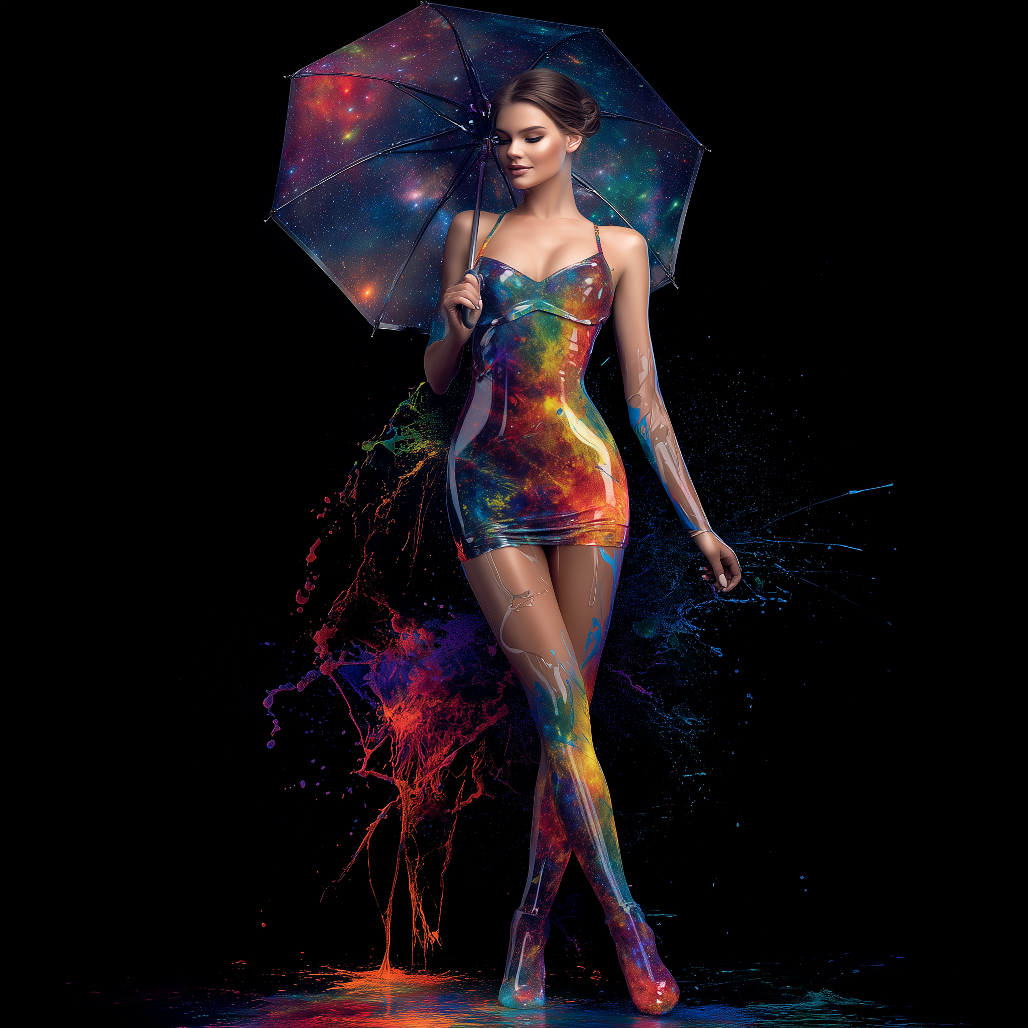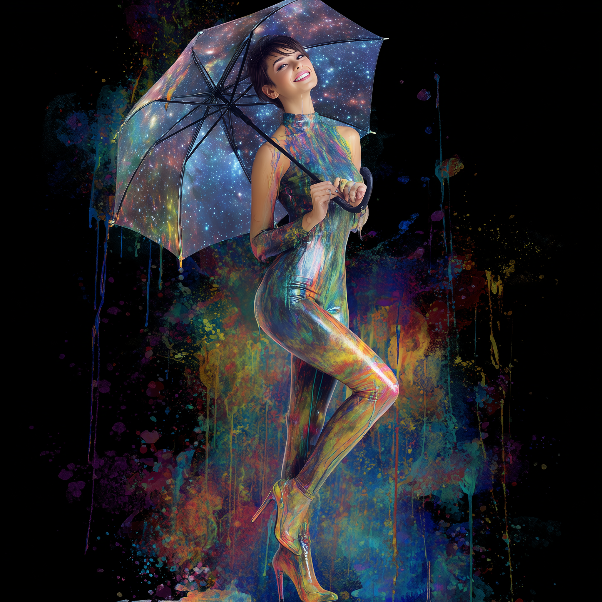 A smiling beautiful woman in a Rainbow-coloured tight-fitting wet spandex body stocking dripping with rain, a cosmic force pattern on the dress. The female is wearing high heels and holding a galaxy-themed umbrella. It’s essential that each colour spectrum is clearly visible and that the female stands out against a vividly coloured background. –ar 1:1 –v 7.0 –p okg484f –raw