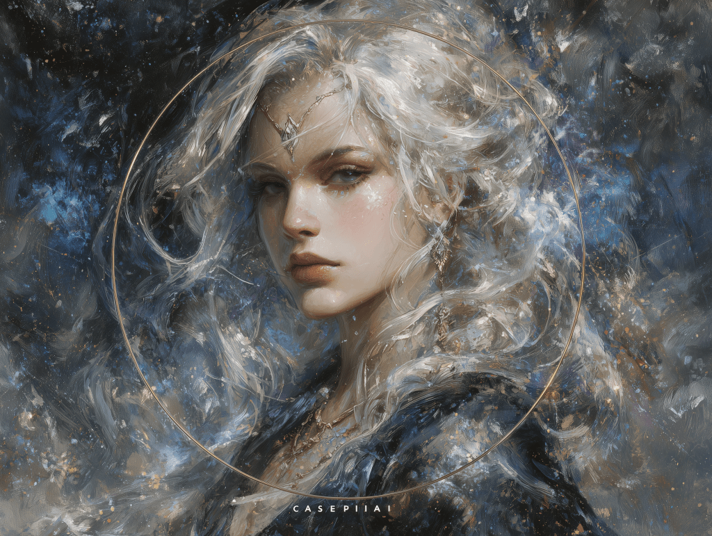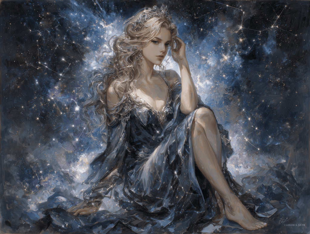 Cassiopeia, the radiant queen of the northern heavens, emerging from the stars of her constellation five bright jewels forming her celestial “W” throne portrayed as a young, graceful queen wearing elegant, form-fitting celestial robes of silk and starlight, regal yet ethereal, illuminated by the Milky Way behind her, crown shimmering with constellations, long flowing hair blending into nebula clouds, night sky filled with cosmic dust and auroral light, mythic and divine atmosphere, painterly realism, exquisite detail, soft luminescence, 4k astrophotography and fantasy illustration fusion –ar 4:3 –exp 50 –v 7.0 –p okg484f –raw