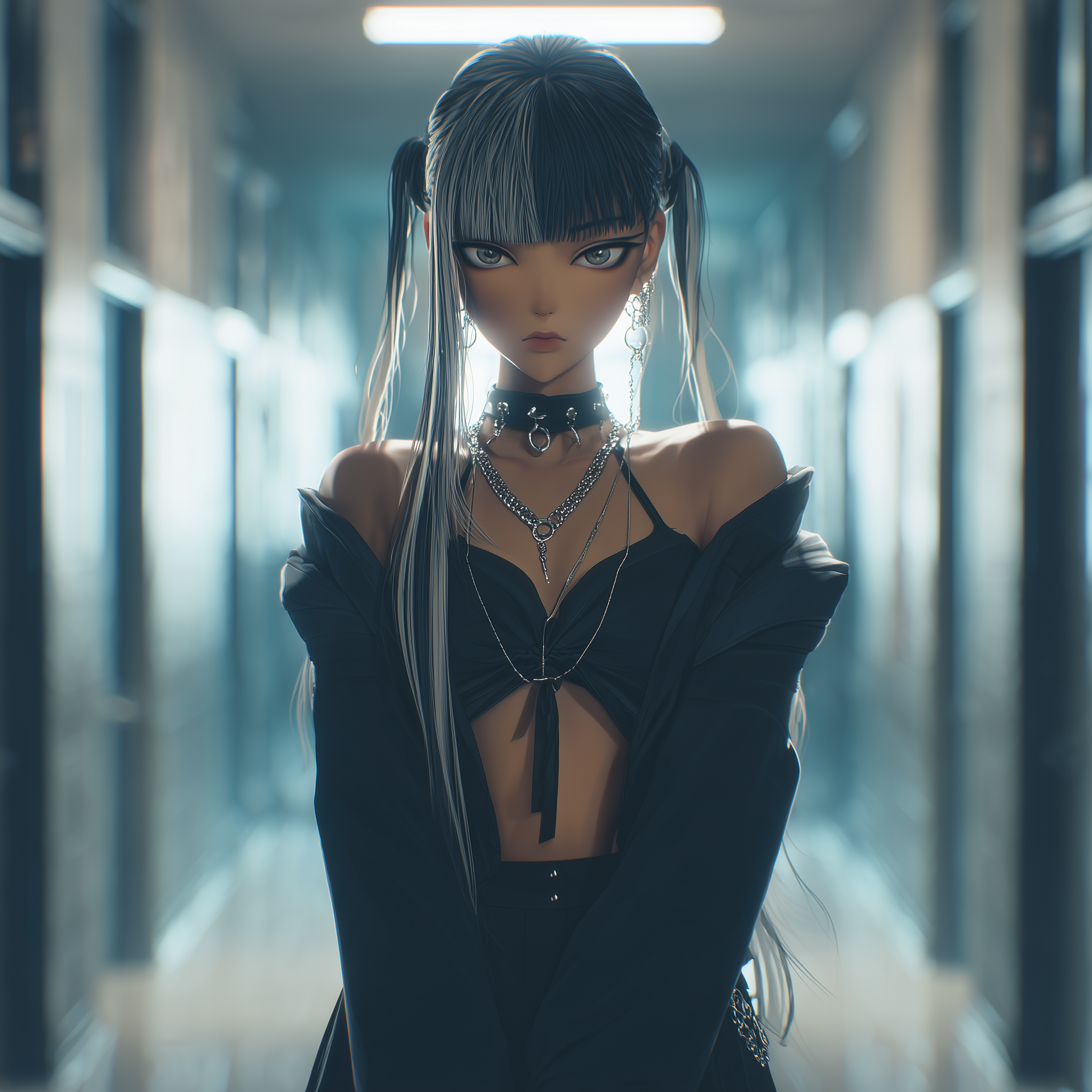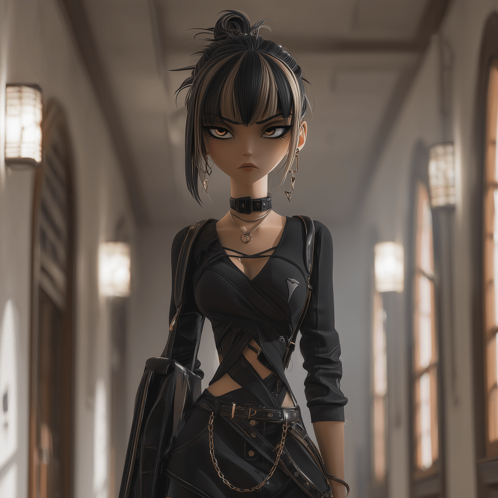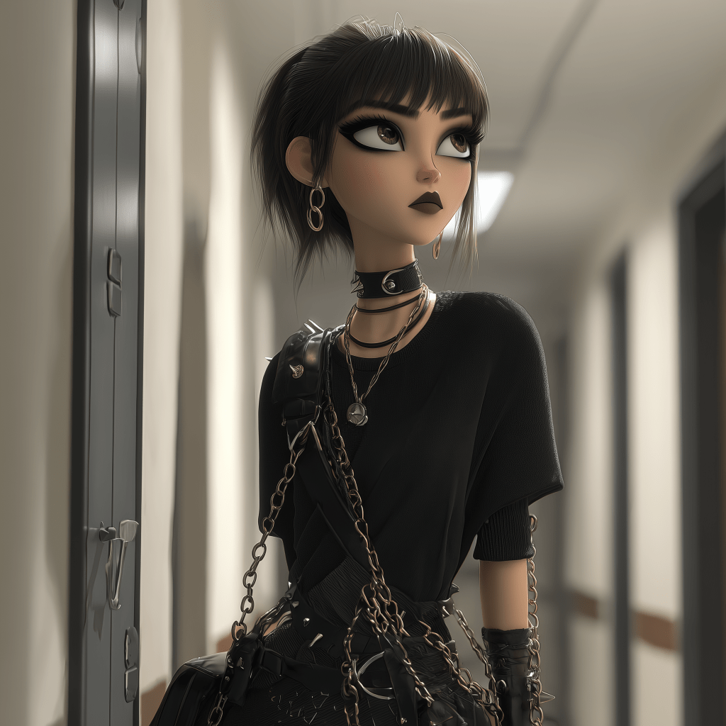 stylized animation style portrait of a southeast asian high school girl with brown skin dressed in a trendy goth outfit dyed hair and bangs stands in a high school hallway 8k – –ar 1:1 –v 7.0 –p okg484f –raw