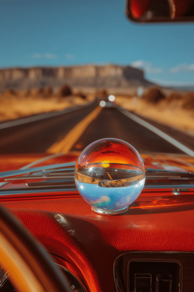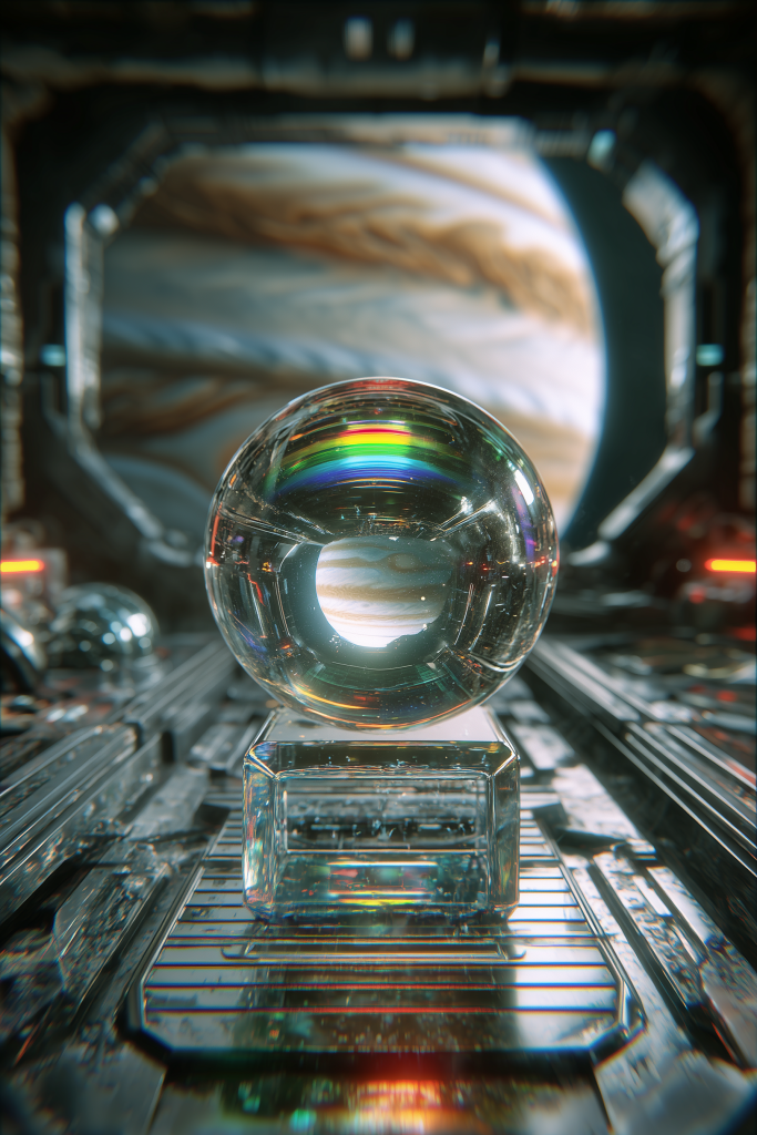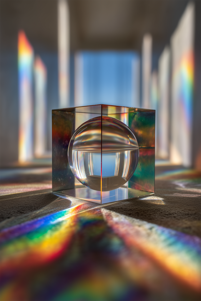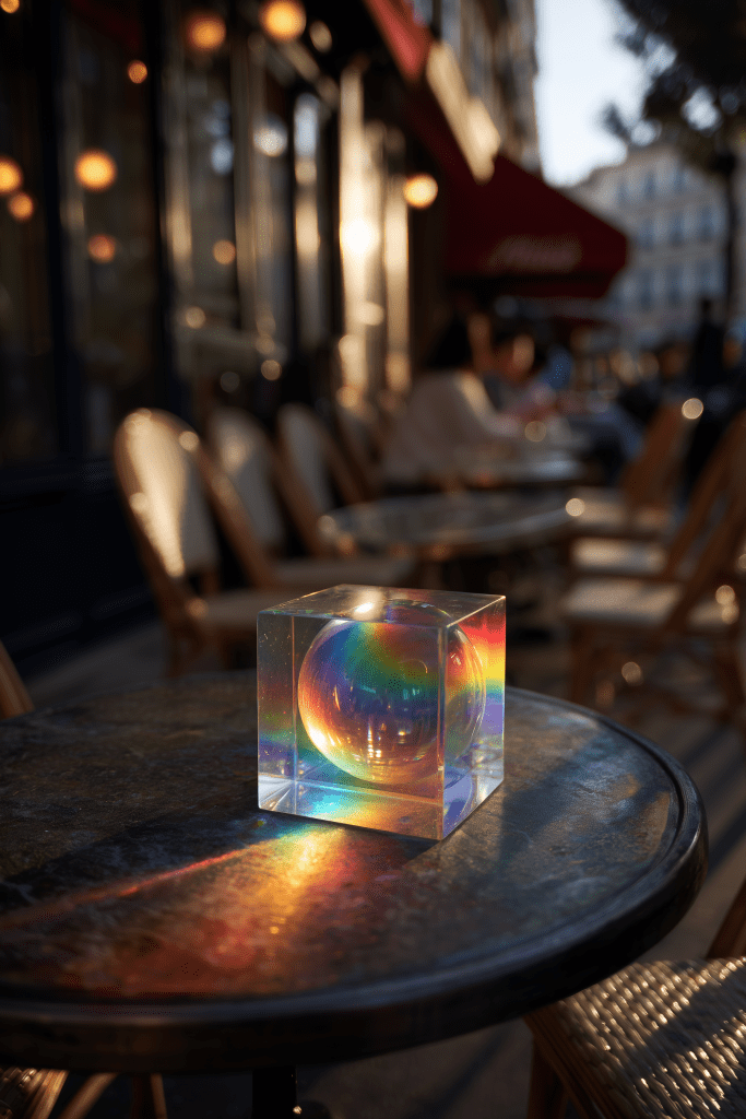 a surreal dream sequence of a rainbow orb inside a glass cube sitting on a table at a sidewalk cafe in Paris –ar 2:3 –v 7.0 –raw