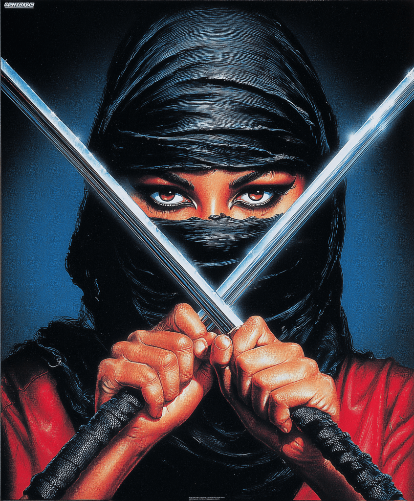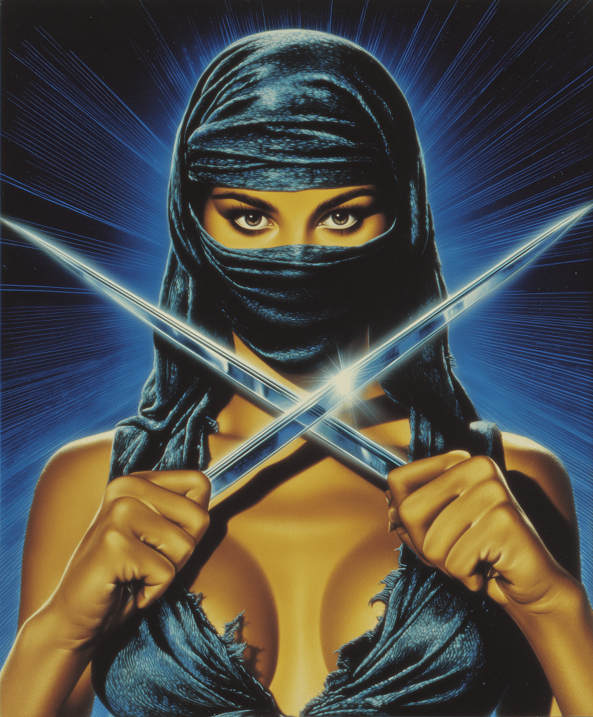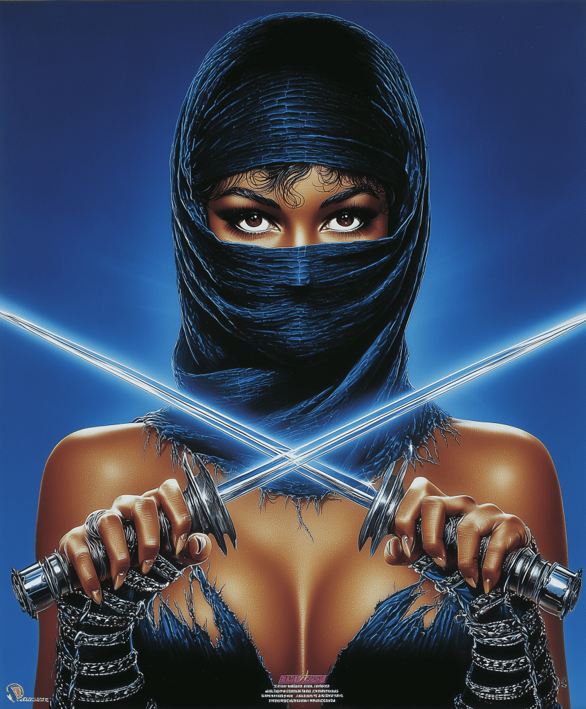 A highly detailed 1980s airbrush-style illustration of a full-body hooded female ninja warrior in torn leather robes, gripping dual glowing ninja daggers, fully centered and isolated, no logos or text –ar 5:6 –profile nmtpqi6 2mg264u –stylize 150 –v 7.0 –raw