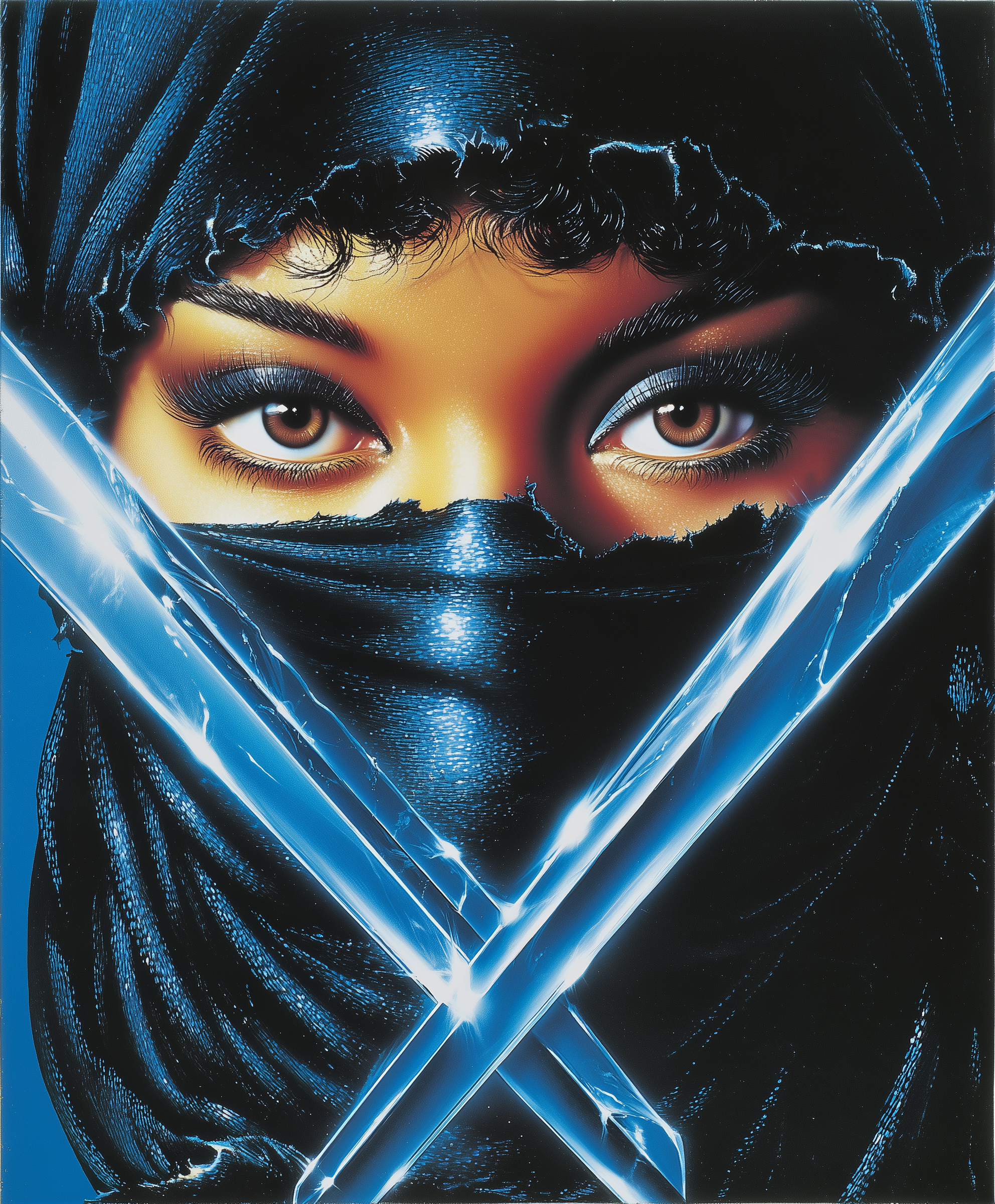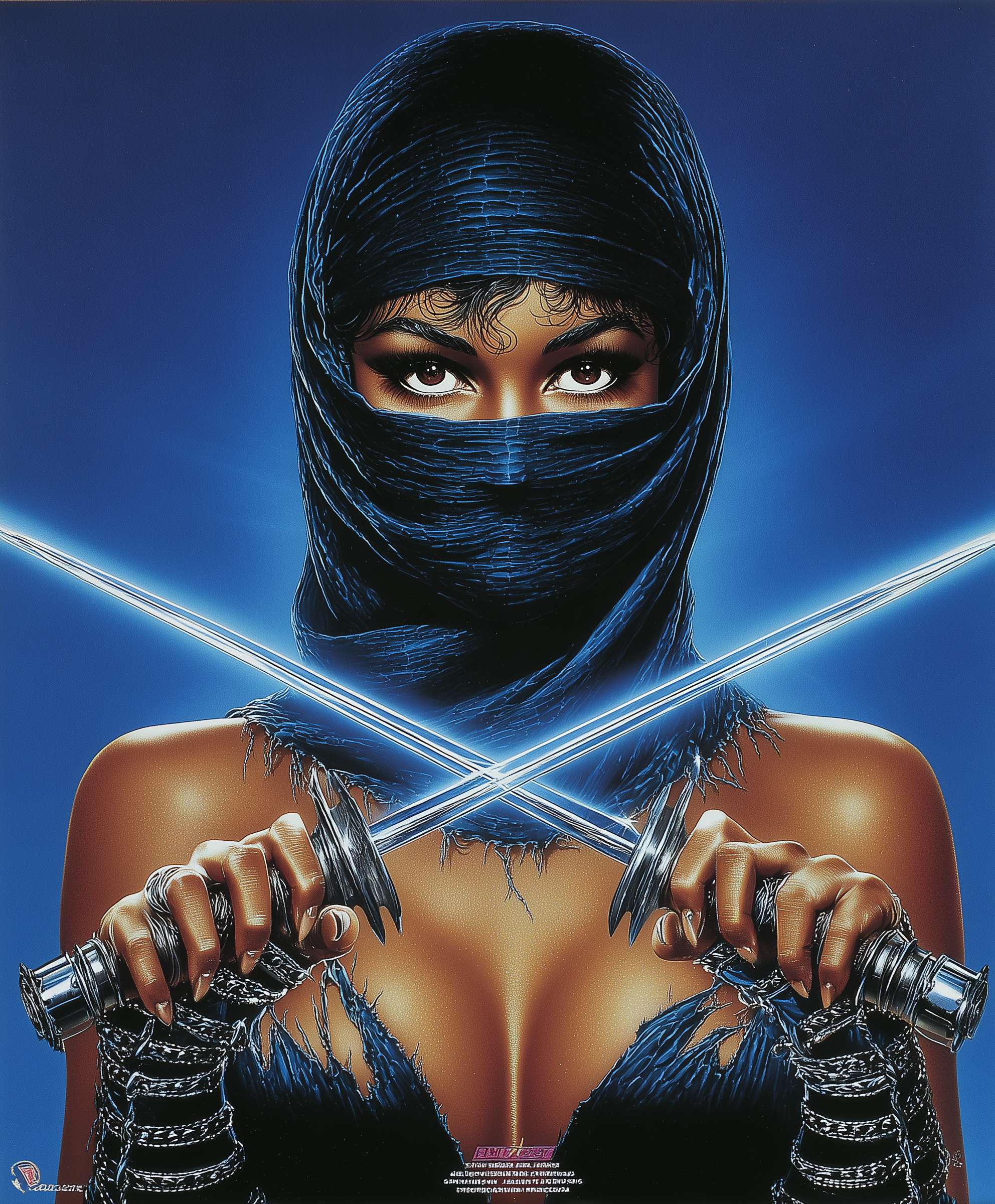 A highly detailed 1980s airbrush-style illustration of a full-body hooded female ninja warrior in torn leather robes, gripping dual glowing ninja daggers, fully centered and isolated, no logos or text –ar 5:6 –profile nmtpqi6 2mg264u –stylize 150 –v 7.0 –raw