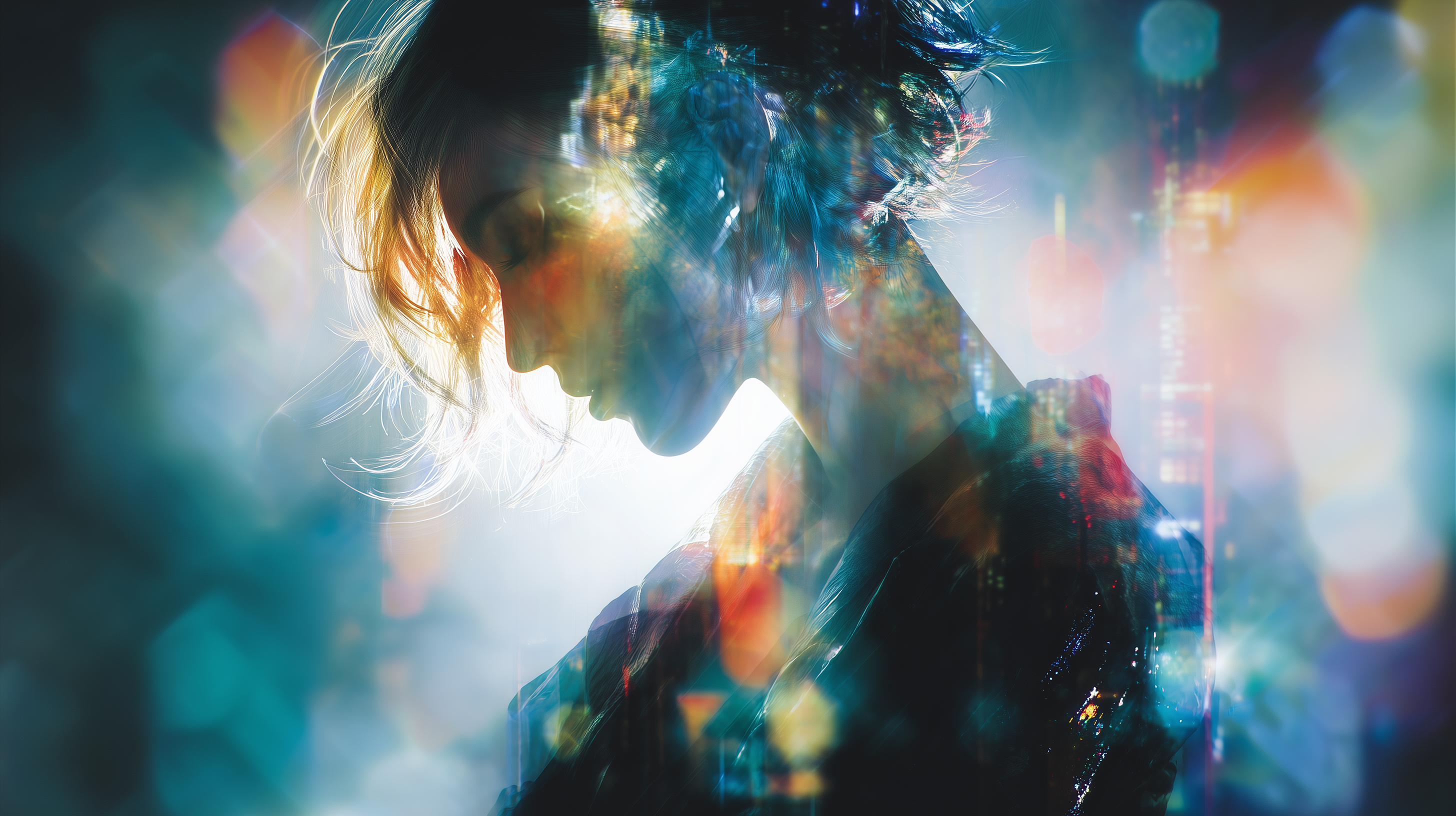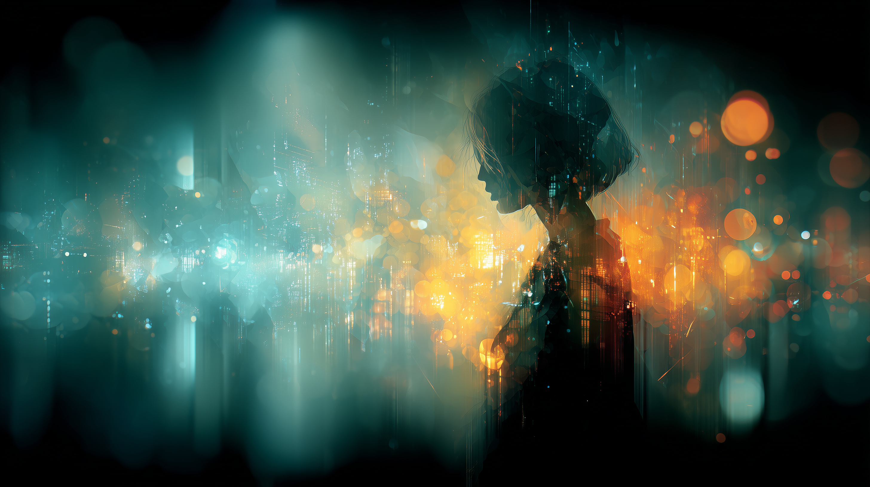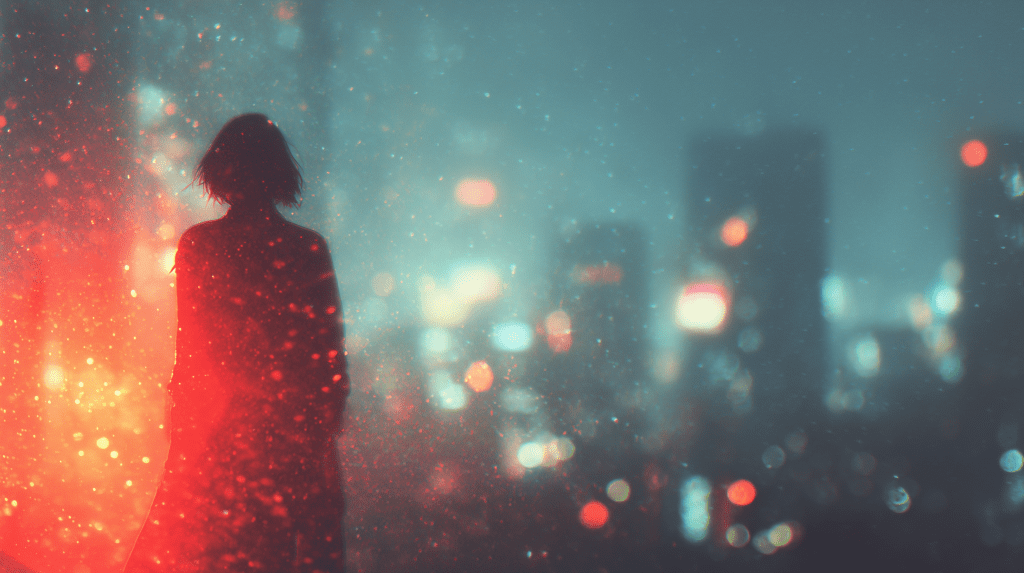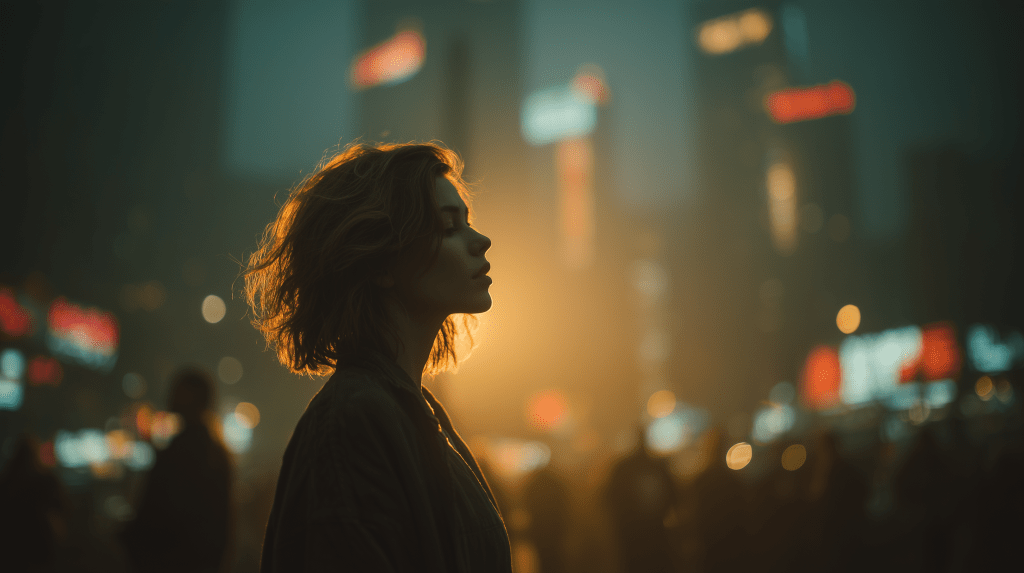 A wide angle 6mm image of a futuristic city skyline at night behind a lone female figure, intense bloom lighting, exaggerated light bleed, soft glow over bright highlights, bright neon signs blooming softly, subtle lens bloom, film halation, gentle diffused glow, black mist filter, glowing light bleed, background out of focus with bokeh, shallow DOF, cinematic diffusion, soft neon halation, dreamy atmospheric glow –ar 16:9 –v 7.0 –s 250 –raw