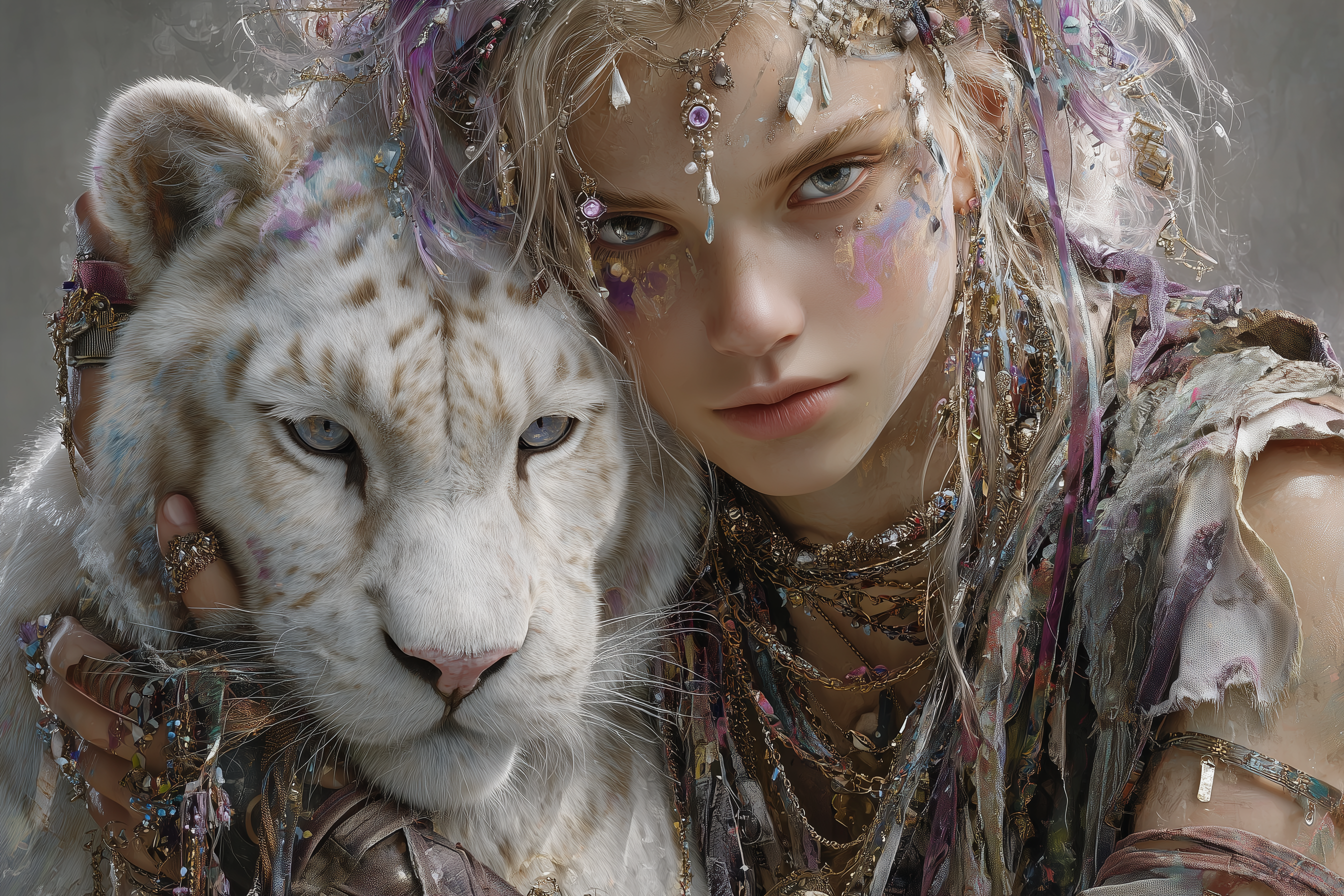a closeup of a beautiful boho-punk woman standing confidently, wild curly purple-and-white hair threaded with handmade charms, glowing crystals, metallic filigree, and braided leather accents. intricate layered jewelry, woven cords, reclaimed metal ornaments, iridescent gems, delicate face markings, and subtle ceremonial paint. she wears a distressed sleeveless top with fringe, patchwork textures, and mixed natural fabrics, paired with thigh-length worn denim cutoffs. large, well-worn leather boots with straps and mismatched accessories. a softly glowing bohemian tattoo on her arm. beside her, a majestic white panther presses her forehead to the woman’s, an intimate bond, best friends forever. background: a dreamy, bustling futuristic outdoor café with handmade décor, soft autumn colors, gentle light, and a warm, artistic atmosphere. ultra-detailed, raw, cinematic, 4k uhd, soft fall palette. –ar 3:2 –exp 25 –v 7.0 –s 250 –p okg484f –raw