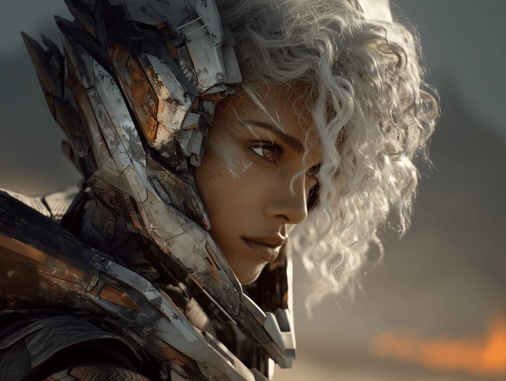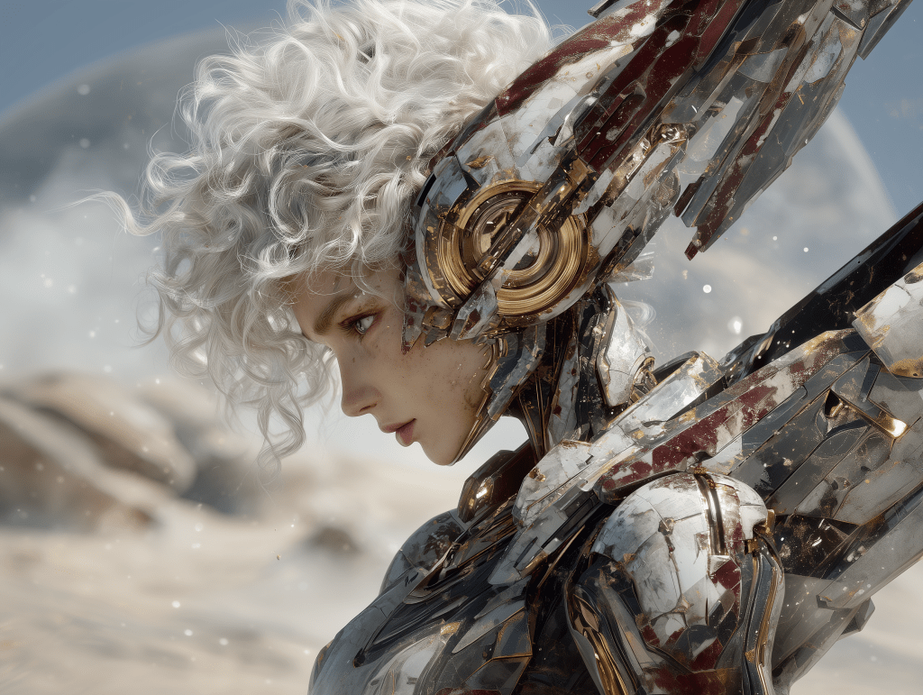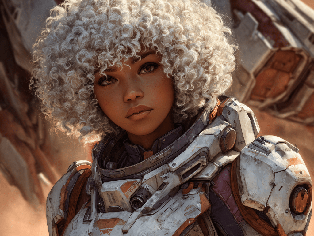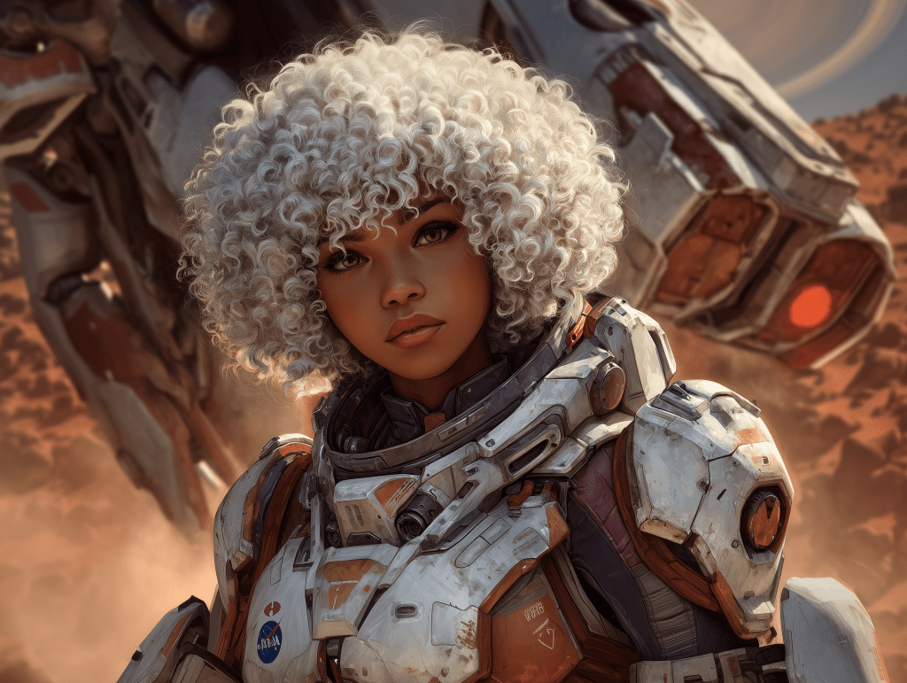 a close-up of a woman with curley white hair in a form-fitting space suit with her helmet off looking at a damaged and on fire scout spacecraft, the background is simmering desert, in the sky is Saturn show off her rings –ar 4:3 –exp 50 –v 7.0 –s 250