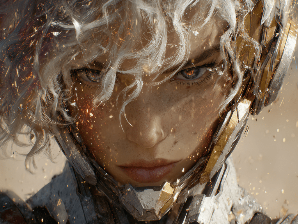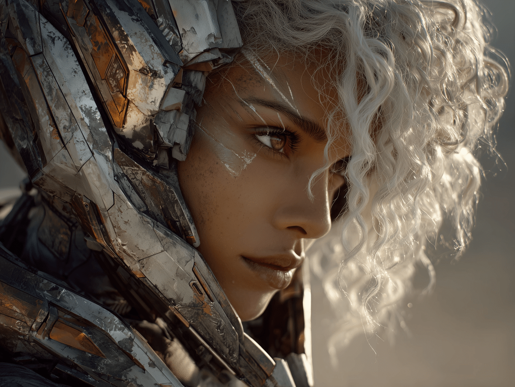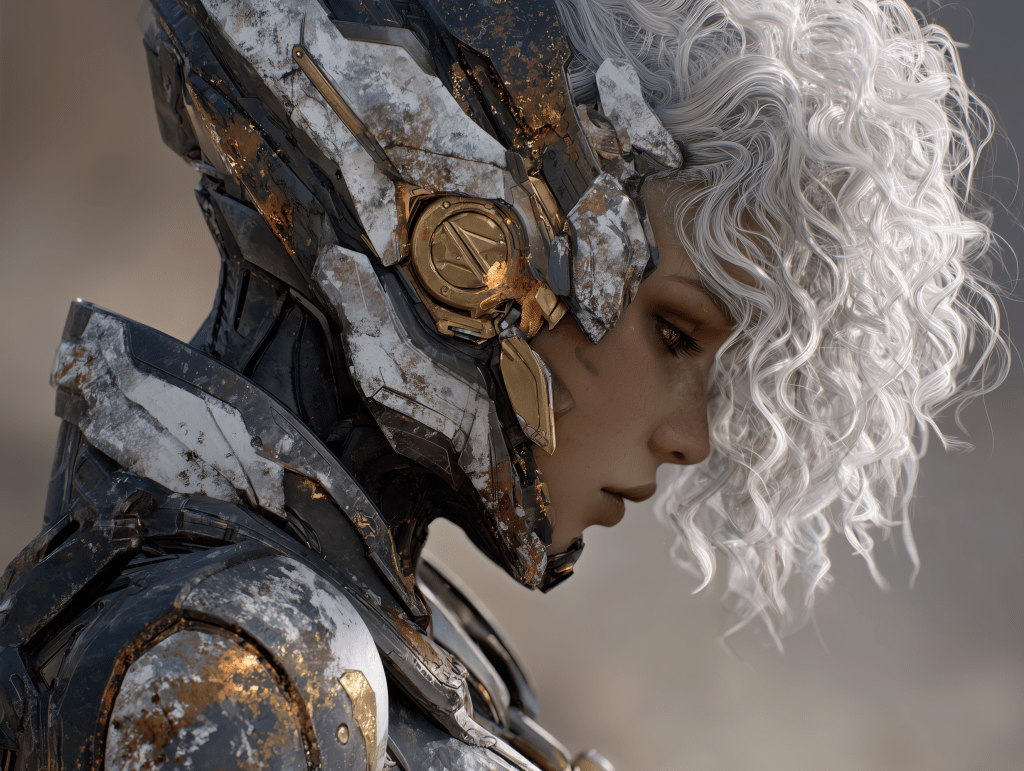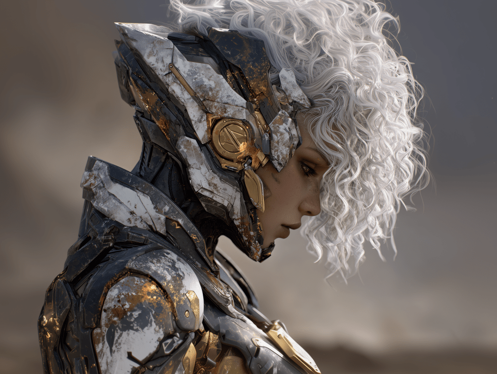 a close-up of a woman with curley white hair in a form-fitting space suit with her helmet off looking at a damaged and on fire scout spacecraft, the background is simmering desert, in the sky is Saturn show off her rings –ar 4:3 –exp 50 –v 7.0 –s 250