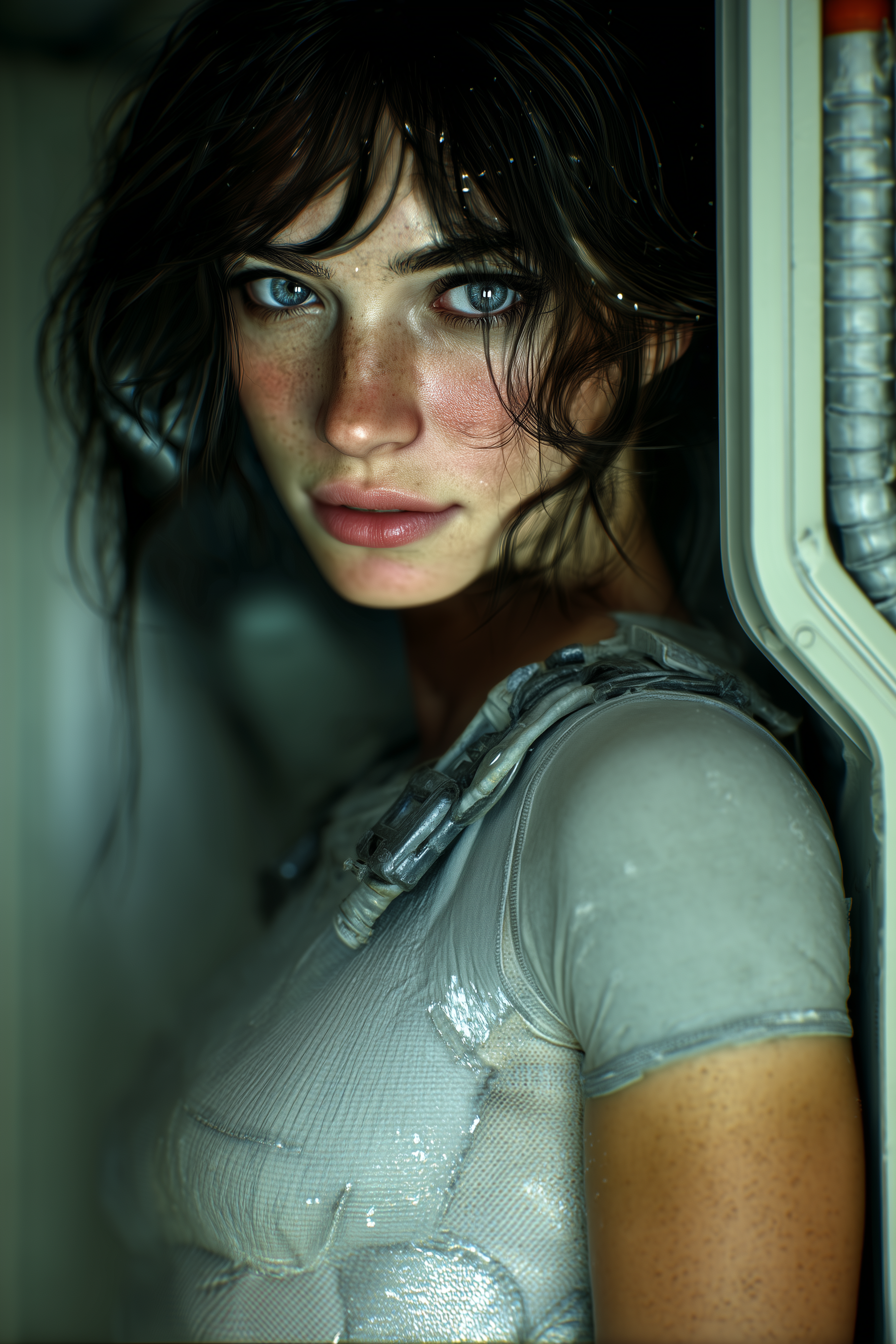 Maia, full-body portrait inside a crew-rated cis-lunar spacecraft interior, hyperreal painterly cinematic realism, female android appearing late 20s, slightly taller than average, athletic but understated build, subtly elongated proportions, relaxed but upright posture, weight shifted gently to one side, left hand hanging loosely at her side, right hand resting on her hip with a crooked arm, prioritizing companionship over authority, readiness over passivity, gentle head tilt echoing the stillness of her gaze, quiet observational presence wearing a form-fitting high-tech spacecraft flightsuit made of light Kevlar-like armored material, segmented armored fabric with pressure-rated with reinforced articulation joints, designed for vacuum exposure and environmental resistance, pressure-safe, functional seams, no decorative elements, femininity retained through fit not emphasis, shoulders visually emphasized over torso, body secondary to presence suit color and texture harmonized with spacecraft interior, warm white hi-tech Discovery-style environment, clean paneling, soft integrated lighting, calm engineered geometry, she dissolves into her role within the spacecraft, ancient intelligence inhabiting physics, restrained, grounded, mythic through function not spectacle, hiding in plain sight –oref https://s.mj.run/X8-2GNVDPzY –ow 100 –ar 2:3 –v 7.0 –s 250 –raw