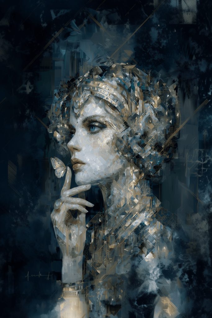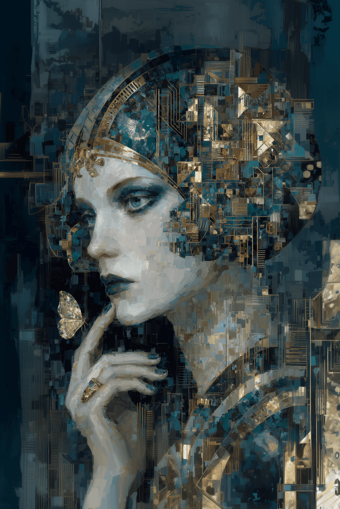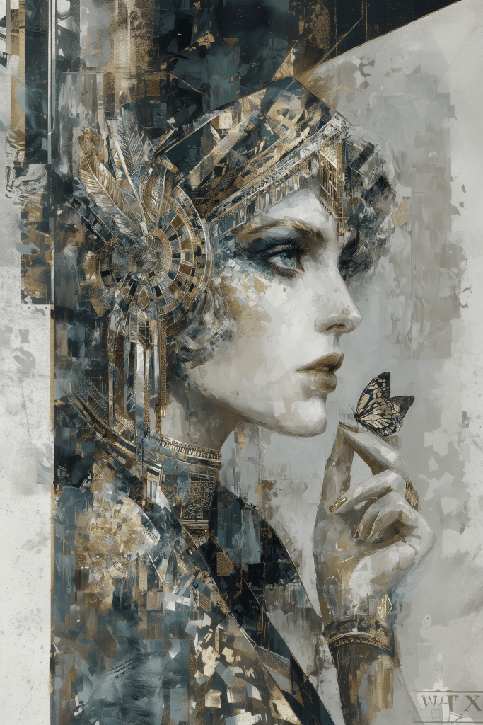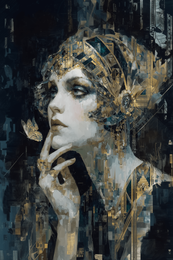 a whimsical oil painting of a beautiful woman with Art Deco design elements, including an elaborate headdress with geometric and ornamental details, depicted in profile view looking upwards towards a small butterfly perched on one finger, with a color palette of black, gold, and shades of green, in a luxurious and elegant room with an aesthetic typical of the Art Deco era, and a simple background to highlight the intricate design. 4k, mist, rays of light, Tyndall lighting –ar 2:3 –exp 50 –v 7.0 –s 250 –p okg484f –raw
