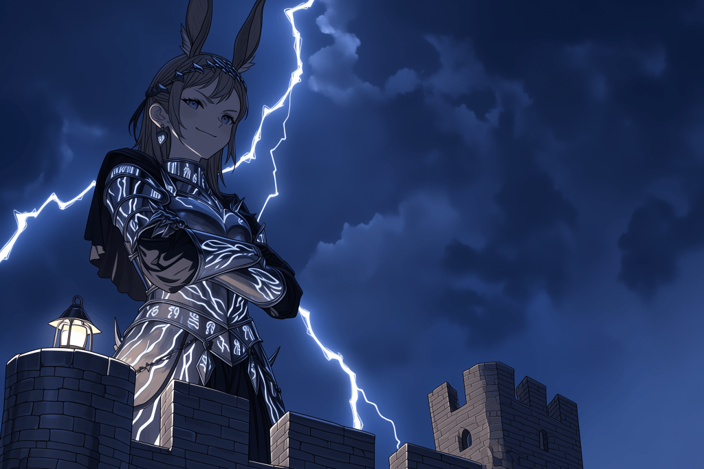 a close-up of a female caster with rabbit ears standing on top of the castle ruins at night. she is wearing black and silver glowing cloth armor that has ancient rune-stone-inspired designs, and her hair also has bunny ears. the sky behind her is dark blue, with storm clouds and lightning bolts flashing, there’s a small glowing lamp sitting next to her. her arms are crossed and she looks confident and determines as if ready for battle. –niji 7 –ar 3:2