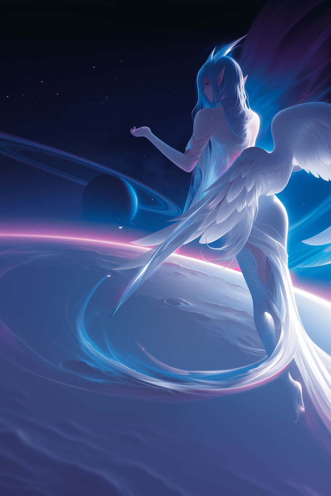 a full-body close-up of a female fantasy elf with ethereal wings on the surface of a magical planet, a distant colssal planet and its rings can be seen in the night sky in the background, a magnificent atmosphere, sleek blue to silver gradient with pink glowing edge –niji 7 –ar 2:3