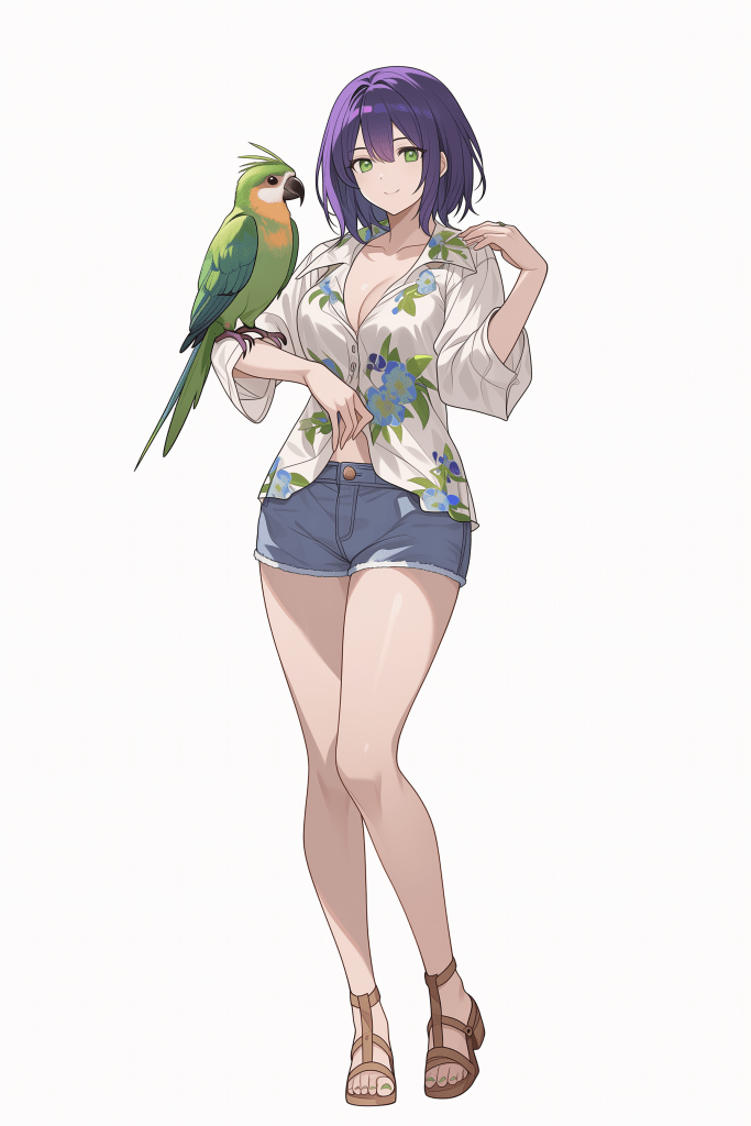 a woman wearing a plunging white shirt with green and blue flowers. she is wearing jean shorts and brown sandals. the character has purple hair and green eyes, her pet bird perches on the side of one arm. there is no background, and the character stands in front of the camera. she wears casual shoes, and the shot is a full-body, full-length view, including her full legs. –niji 7 –ar 2:3