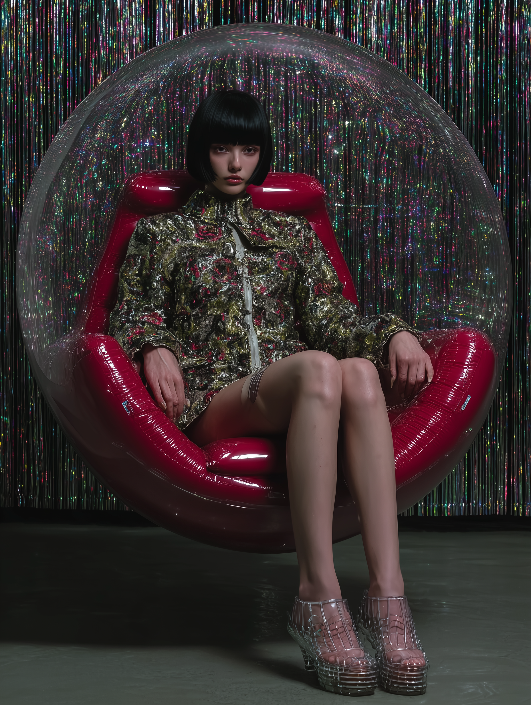 woman sitting in a dreamy inflatable plastic chair, fluo ultra colourful neon lights, 90’s surreal japanese photography, fission of cesium-134 in an otherworldly decor in the style of aeon flux –ar 3:4 –exp 25 –profile g6fei7v –s 250 –raw –v 7.0