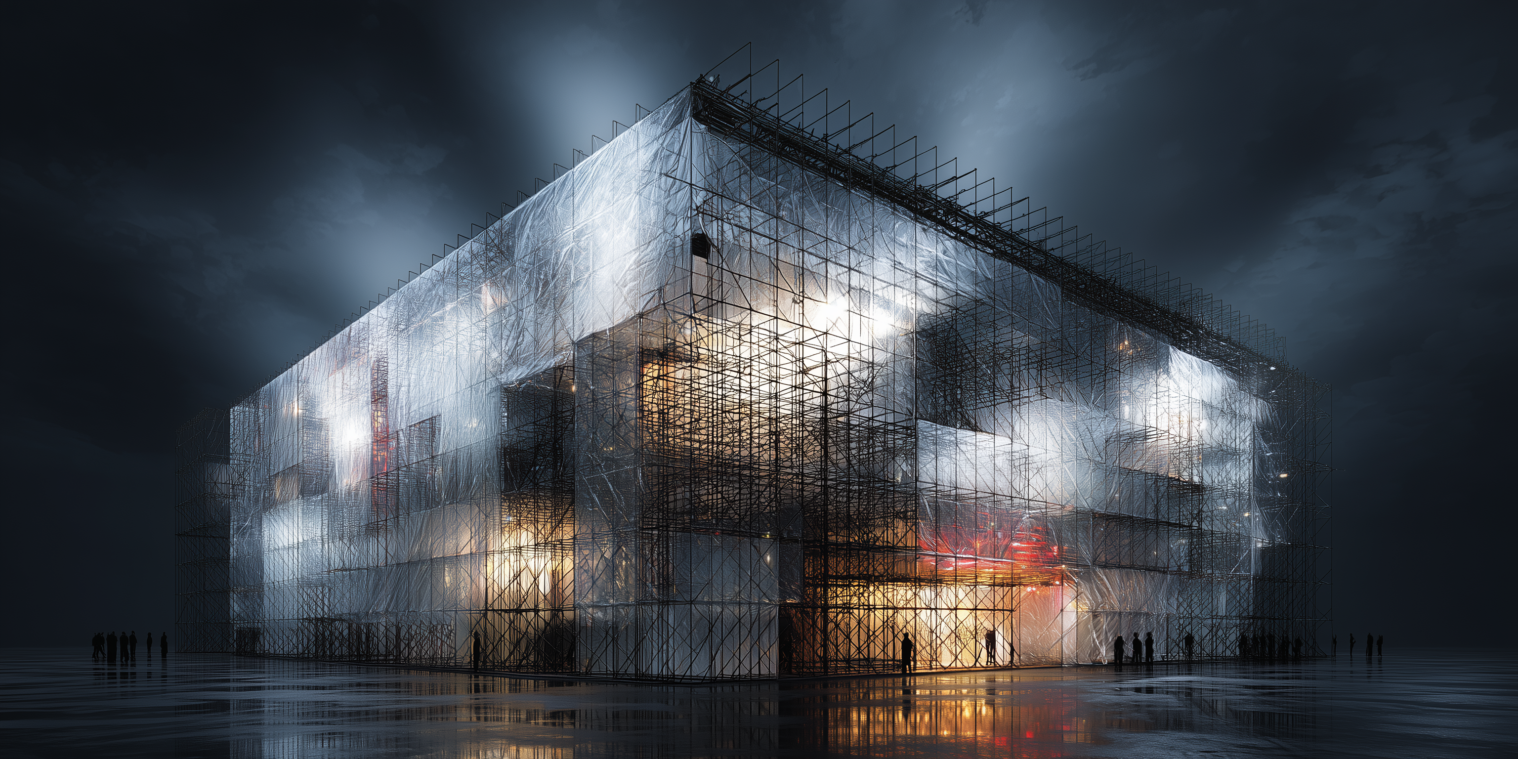 large rectangular temporary building, modern aluminum structure, fully glazed facade, surrounded by a scaffolding network designed like a mondrian-inspired grid, with intentionality and even rhythms and controlled asymmetric placement of vertical and horizontal poles, creating an artistic double-skin envelope, high architectural detail, photorealistic lighting, wide-angle view, ultra-realistic rendering, sharp details, 8k –ar 2:1 –p okg484f –raw
