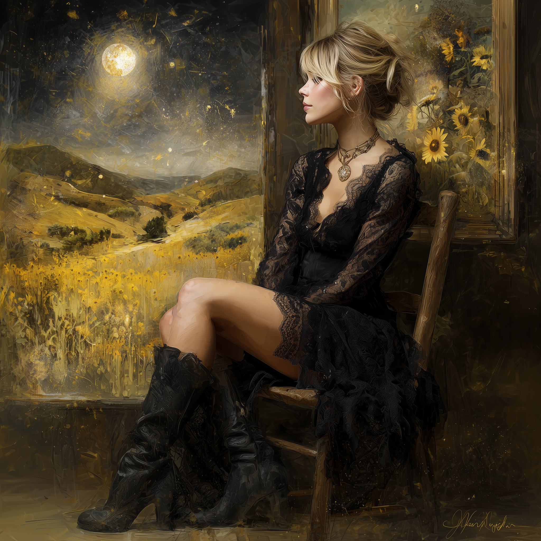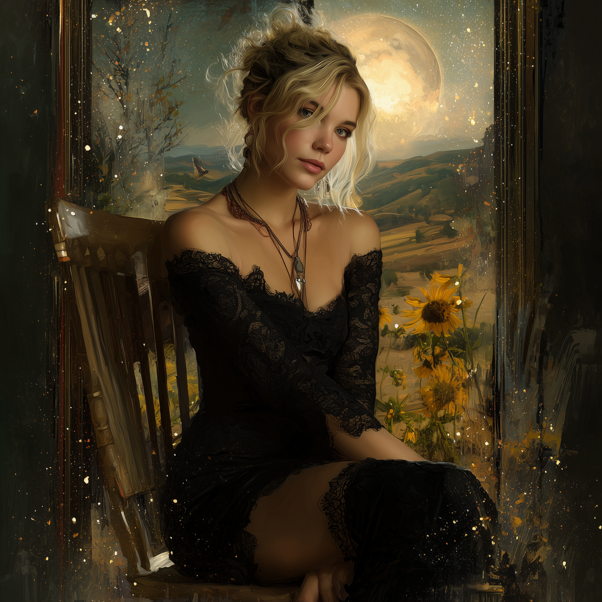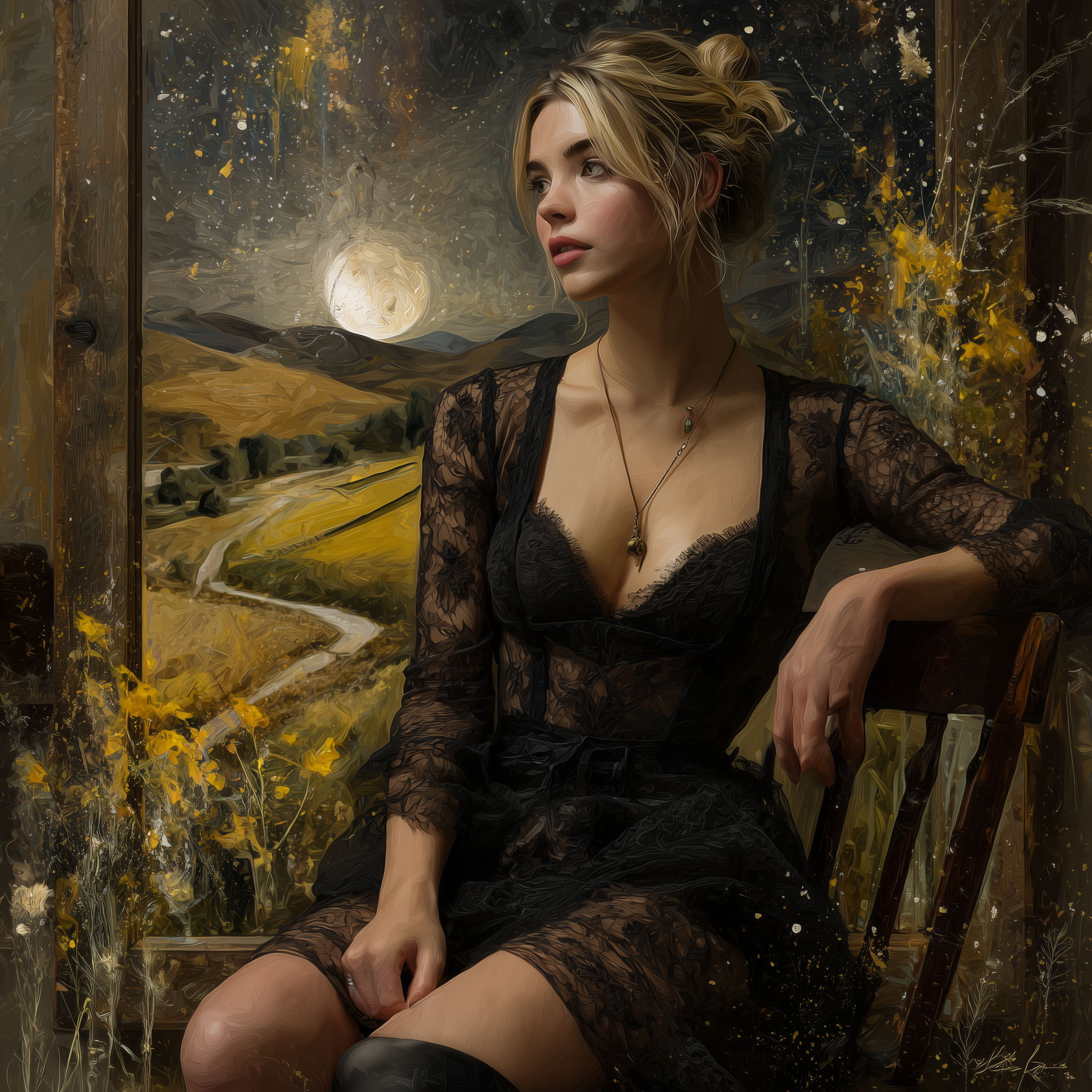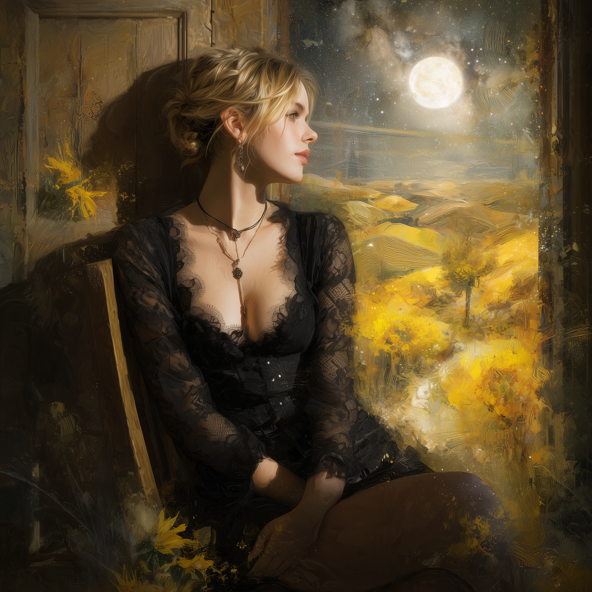 A captivating digital painting of a voluptuous boho woman with blonde hair in a loose updo, seated gracefully on a wooden chair. She has fair skin and wears a black lace dress, adorned with a necklace. The wooden interior is accentuated by a framed artwork on the wall behind her. Sunlight streams in, casting a warm glow on her face, creating an ethereal ambiance. The background reveals an enchanting night sky illuminated by twinkling stars, with a radiant full moon as the centerpiece. The hills below are bathed in warm yellow hues, adorned with swaying yellow flowers and a solitary tree reaching for the moon. A winding path through the hills leads to the horizon, where the sky and earth converge in a mesmerizing scene of serenity and beauty., portrait photography –ar 1:1 –p okg484f –raw –v 7.0