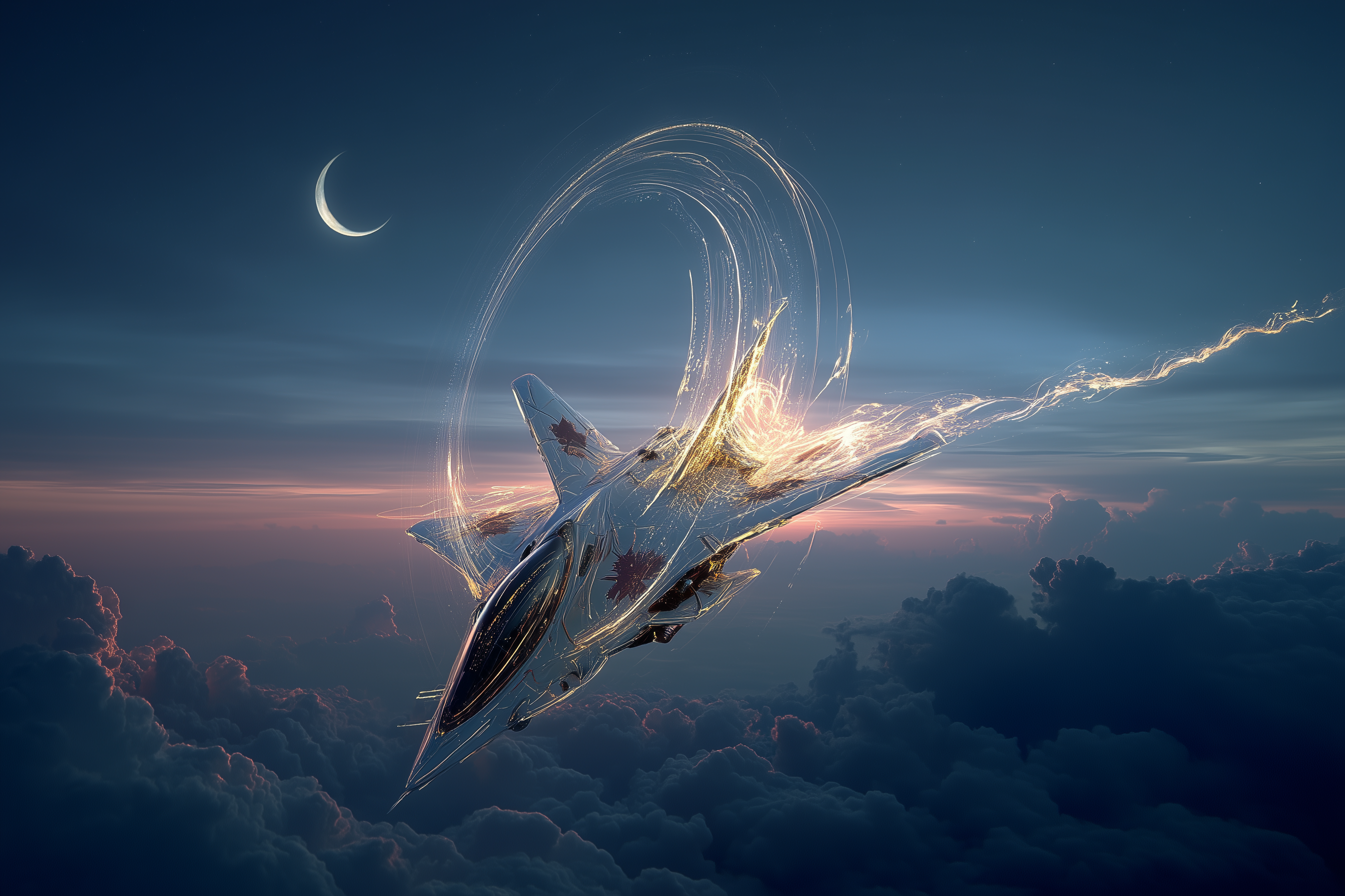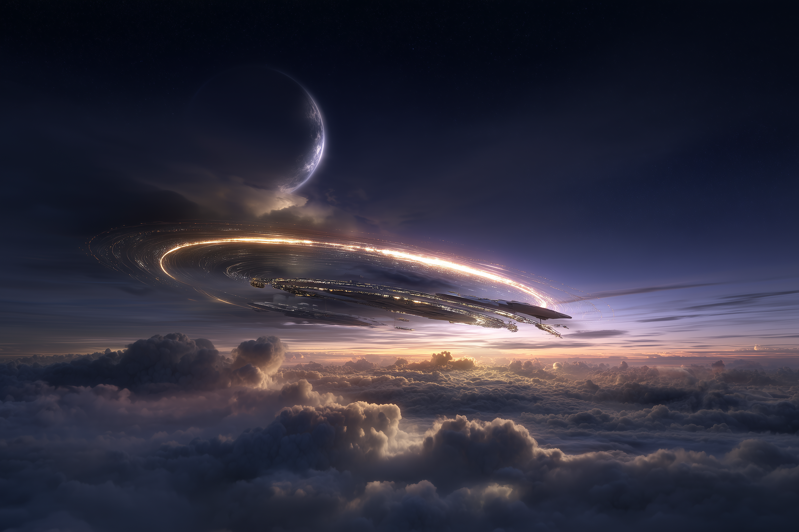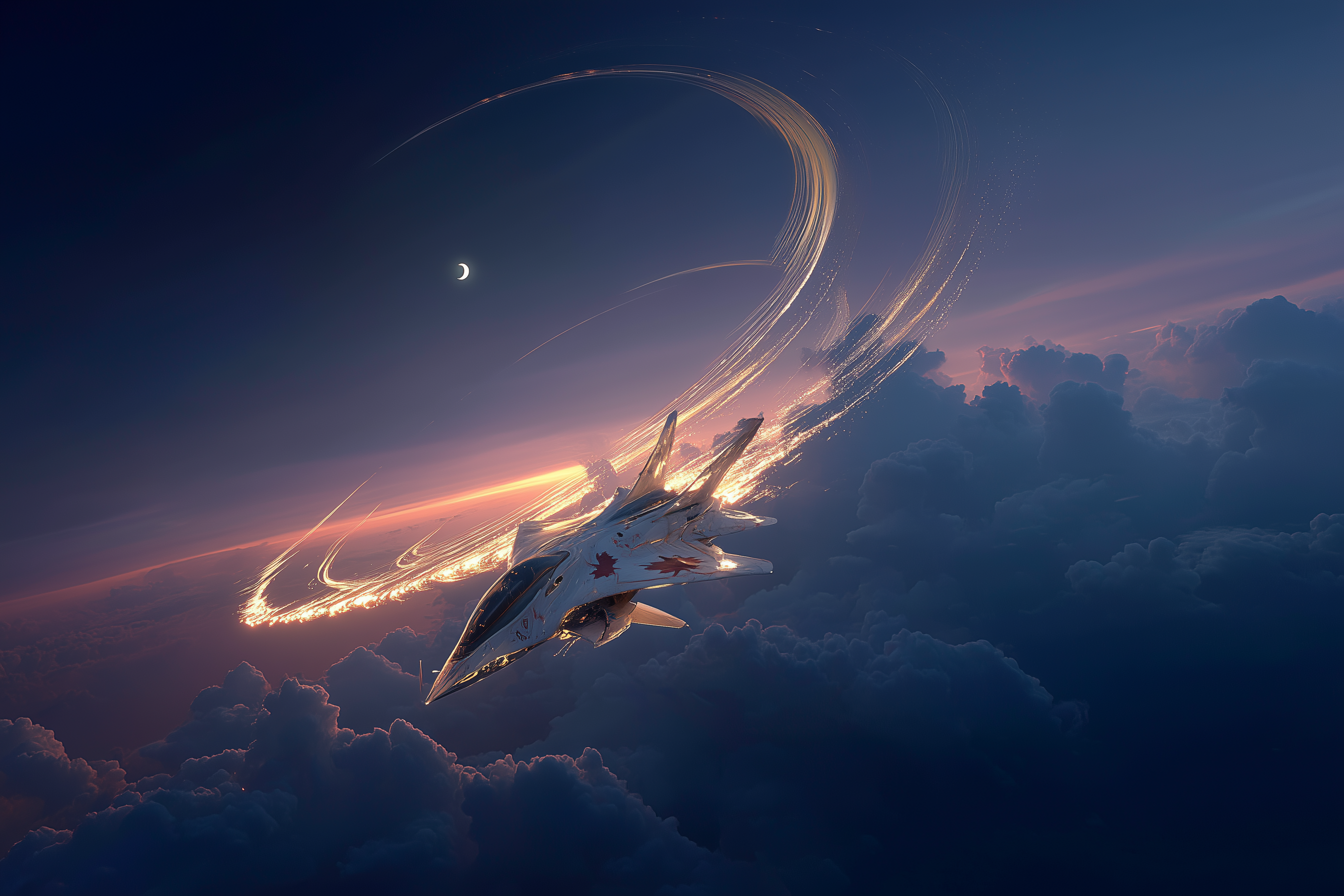 a Canadian human-rated interplanetary spacecraft piercing the heavens right above clouds, it’s twilight, colours of blue to dark purple and black, the sky above the clouds show stars and a crescent moon twinkling in the destance, the spaceship leaves a fantastaical trail of gravitational distortion made visible by sequential rings of glowing gravity ripples that light up the twilight sky, it’s magical, photo realistic, cinematic, the view is up close, the complete topside of the spacecraft is visible as it rises above the clouds –oref https://s.mj.run/Njg3y_s02cs –ow 90 –ar 3:2 –p inh4jj5 –raw –v 7.0