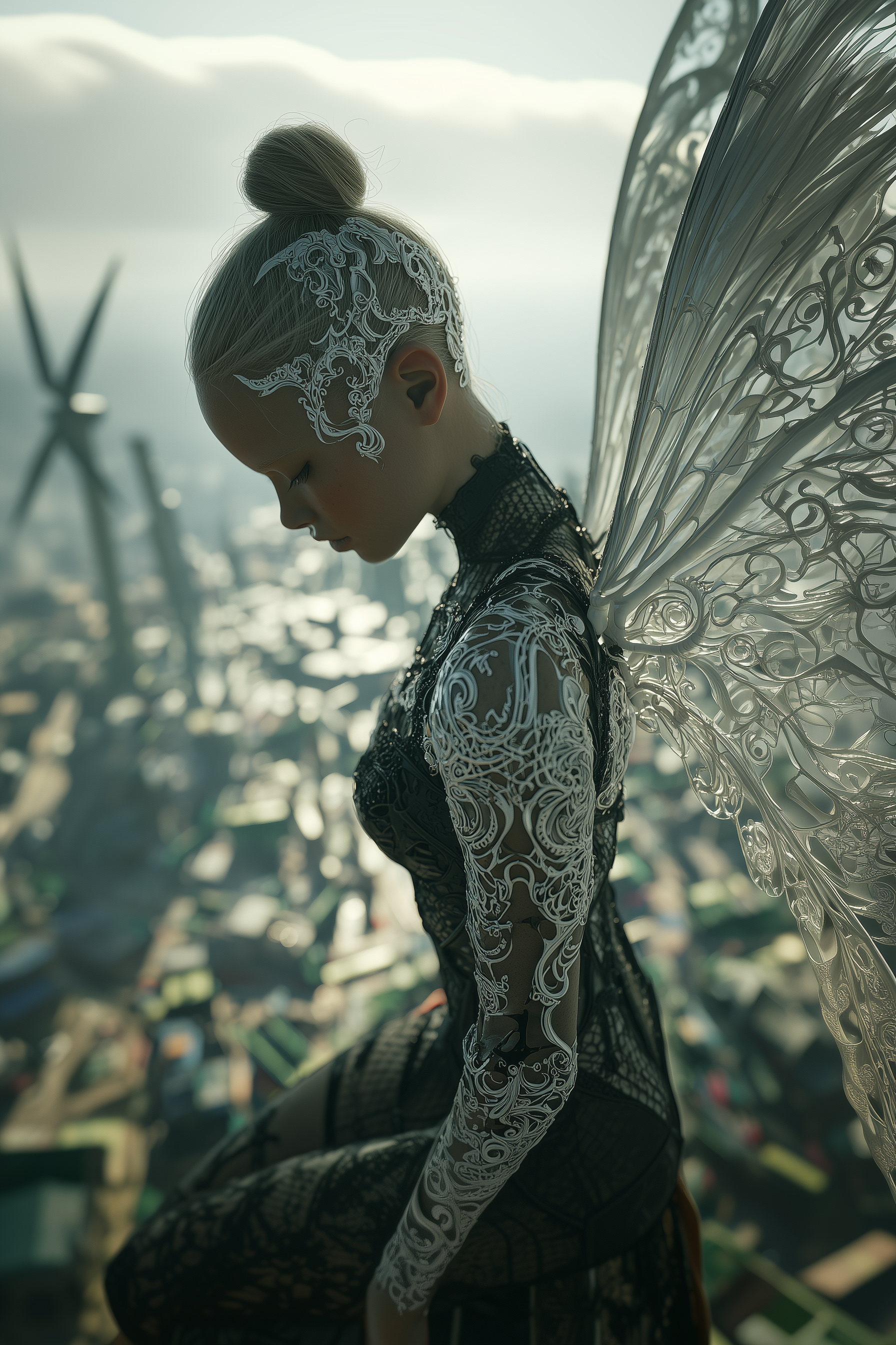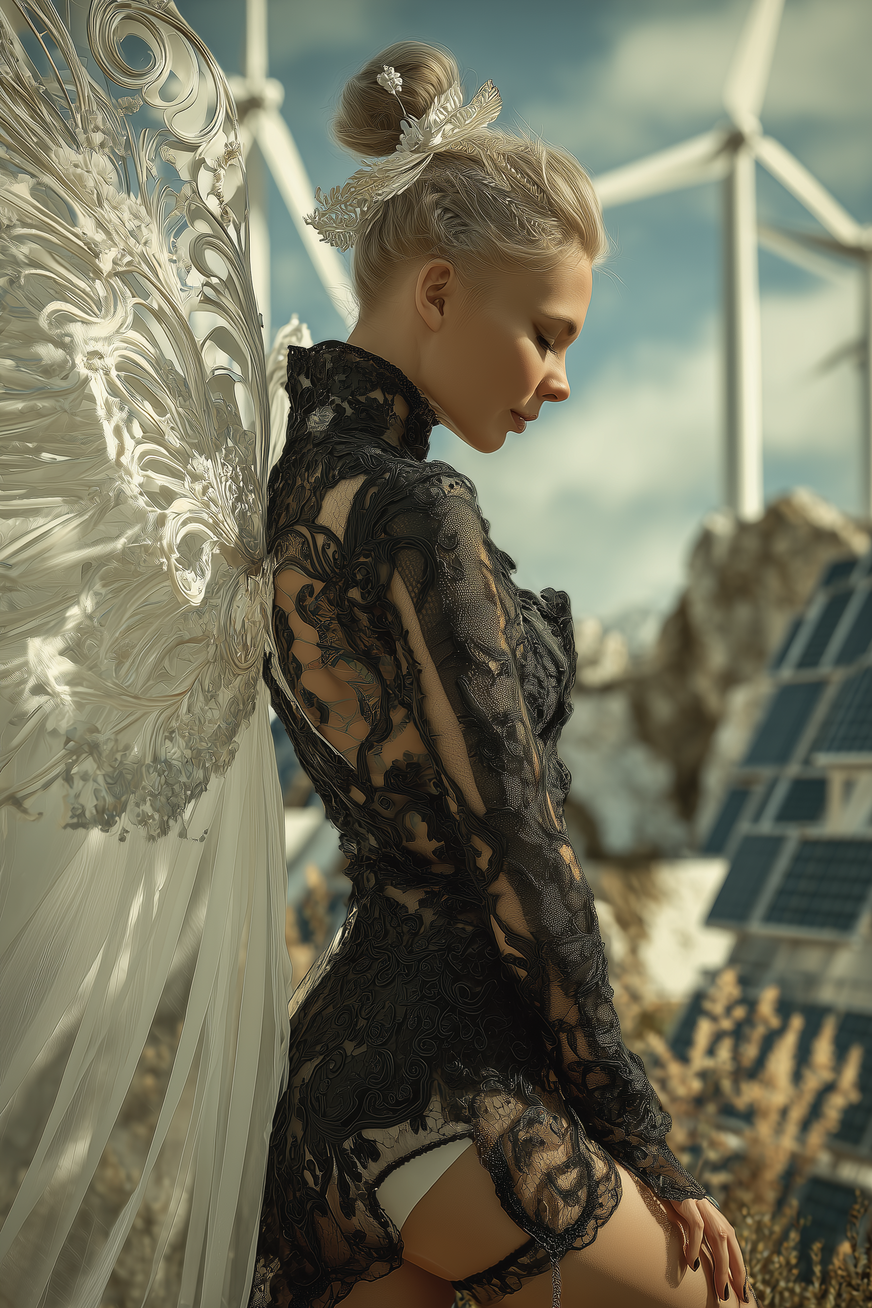 Ancient angel woman, with white filigree wings, wearing a sheer black lace body suit, looking down at thriving midevil villiage with solar panels and tall windmill power generates, she has a peaceful graceful expression on her face, she is wearing flowing transparent light emitting fabric, the environment is one of soft natural light and cinematic lighting. in the style of solarpunk, with low key contrasts and texture skin. Poetry in motion. –ar 2:3 –raw