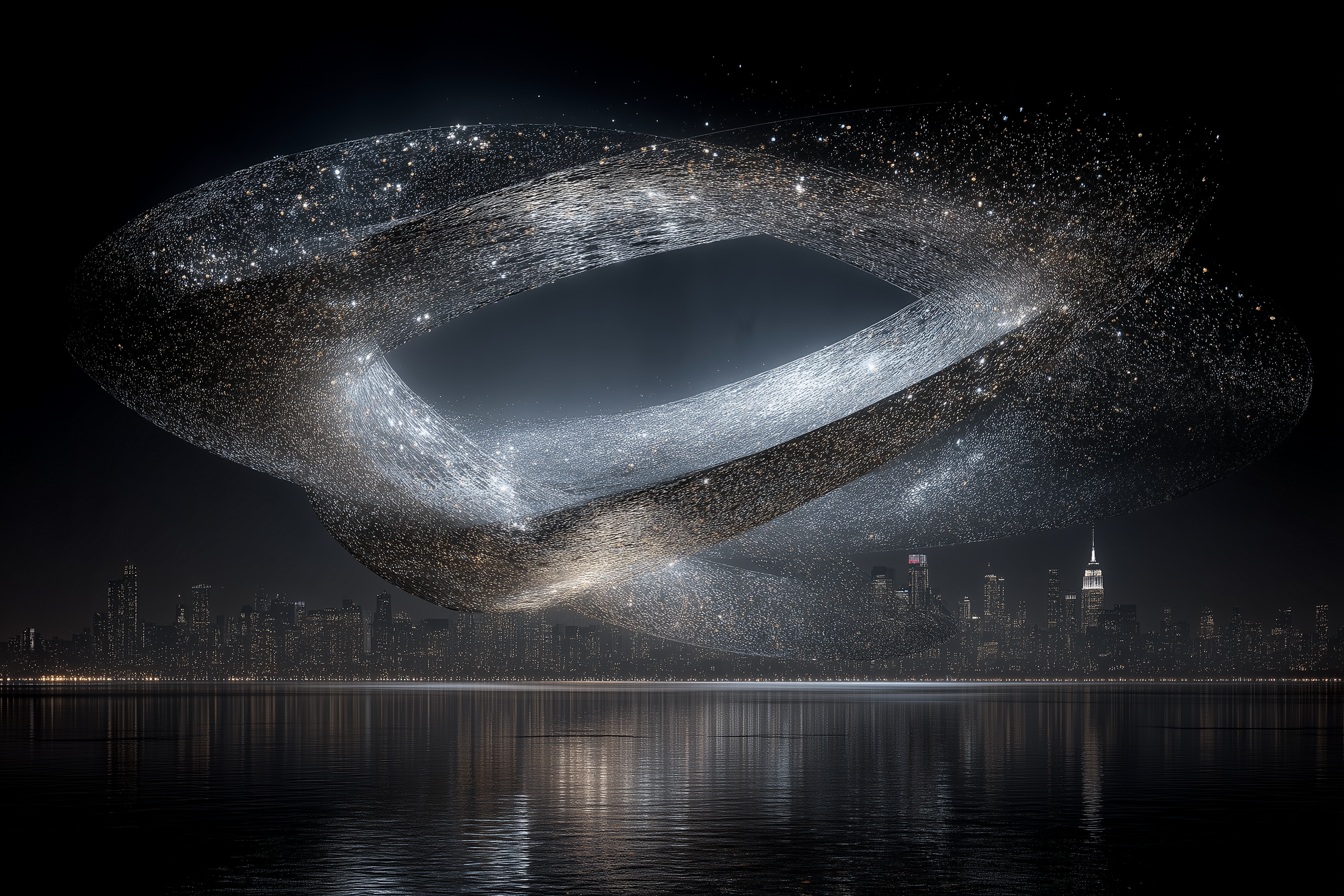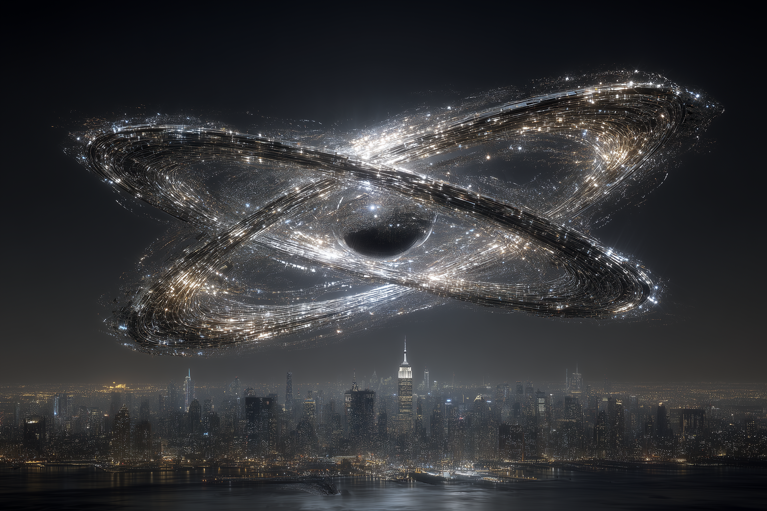 a colossal ophanim-inspired structure composed entirely of multiple interlocking concentric rings and wheels hovers over New York City at night, the rings intersect at precise angles, forming a complex orbital geometry, each ring is densely embedded with hundreds of small realistic eyes physically set into the surface of the rings, evenly spaced, repeating continuously around each circumference, the eyes are identical in scale, facing outward in all directions, clearly visible and numerous, there is no single dominant eye and no symbolic eye only many, mechanical precision combined with living organic detail, ancient, otherworldly, solem, awe-inspiring presence, hyper-detailed, ultra-realistic rendering, sharp focus, high clarity, restrained color palette, no angels with bodies, no creatures, no humanoids, no halos, no symbols, no text, no single large eye –ar 3:2 –exp 25 –p inh4jj5 –raw –v 7.0