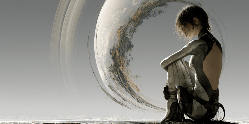 a closeup of a woman in a form-fitting space suit not wearing a helmet sitting on a hill looking over an alien world valley, it is early morning with long shadows from the left side of the image, and in the background is a Saturn-like planet filling most of if not all of the sky –chaos 30 –raw –profile inh4jj5 –stylize 250 –hd