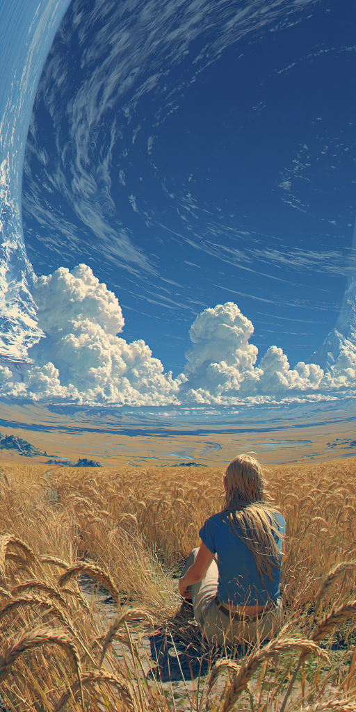 A vast Ringworld megastructure inspired by classic hard science fiction, viewed from the surface at ground level the observer looks forward along the inner curve of the Ringworld, then upward as the land arches overhead, revealing the immense circular horizon. In the foreground, a golden field of wheat sways gently. A woman with long blond hair sits calmly among the wheat, resting, her back to the viewer, contemplative and peaceful. It is midday, with a deep blue sky filled with low-altitude puffy white cumulus clouds and high, delicate cirrus clouds further up, emphasizing depth and scale. On the far left and right edges of the Ringworld, towering snow-capped mountain ranges rise in the distance, subtly curving with the structure. Ultra-detailed, 4K resolution, crisp focus, transparent atmosphere, bold yet natural color palette, bright sunlight, sharp contrast, cinematic science-fiction realism, immense sense of scale, clean hard-SF aesthetic, no text, no borders. –raw –hd