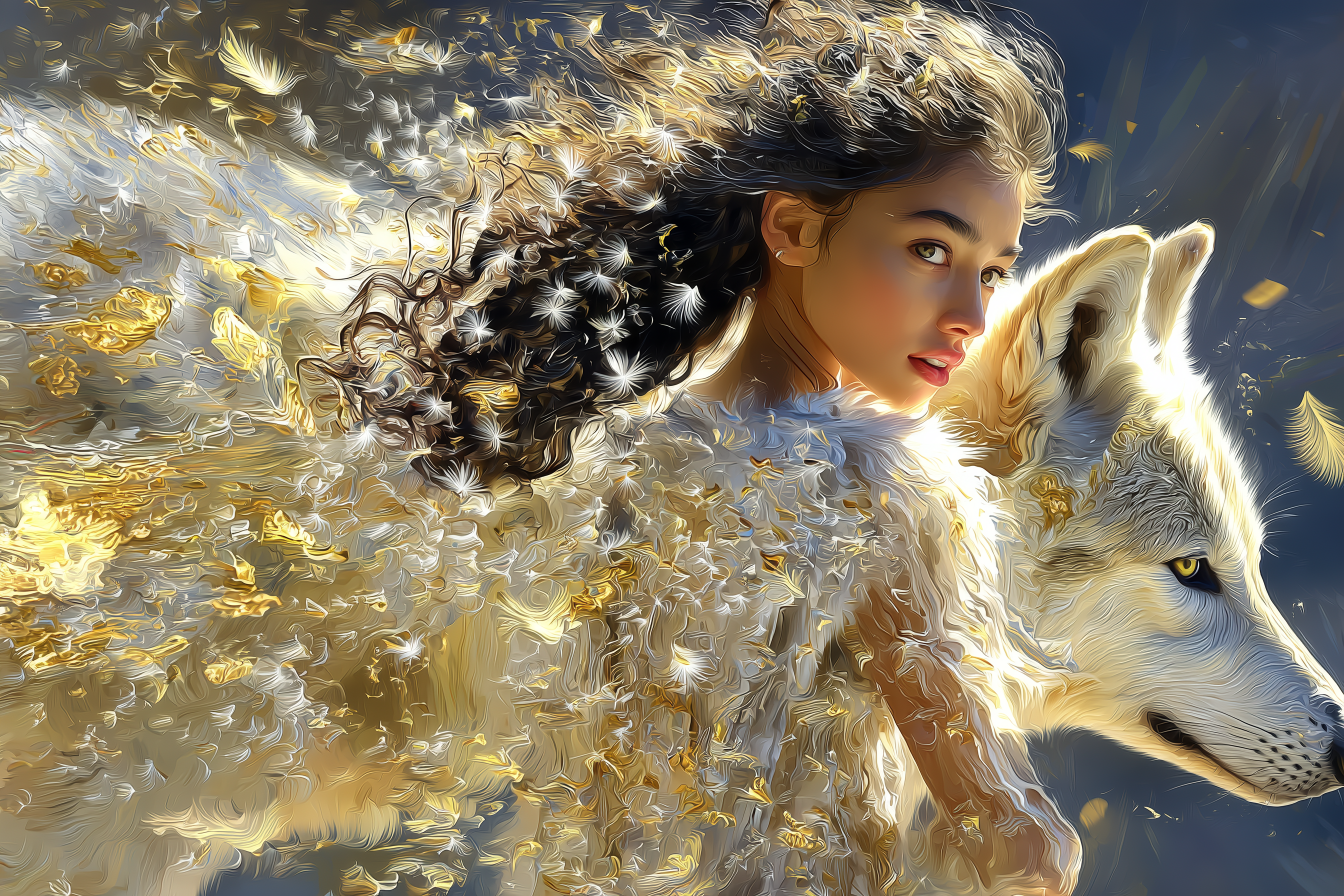 Encaustic post-impressionist painting, Van Gogh style, a beautiful woman on a sacred journey, back to the viewer, turning to look over her shoulder with a knowing gaze, long curly black hair streaming in motion, wearing a white wolf-fur gown that dissolves seamlessly into the coat of a great spectral white wolf walking silently beside her, wolf and woman sharing the same luminous amber-blue eyes, their spirits visibly intertwined, the wolf’s form half-flesh half-golden light, dandelion seeds and impasto brushstrokes flowing between them like shared breath, neither leading nor following — bonded equals, churning cobalt blue and gold background whorls, encaustic wax surface texture, sacred luminous glow –ar 3:2 –v 7 –sref [your url]