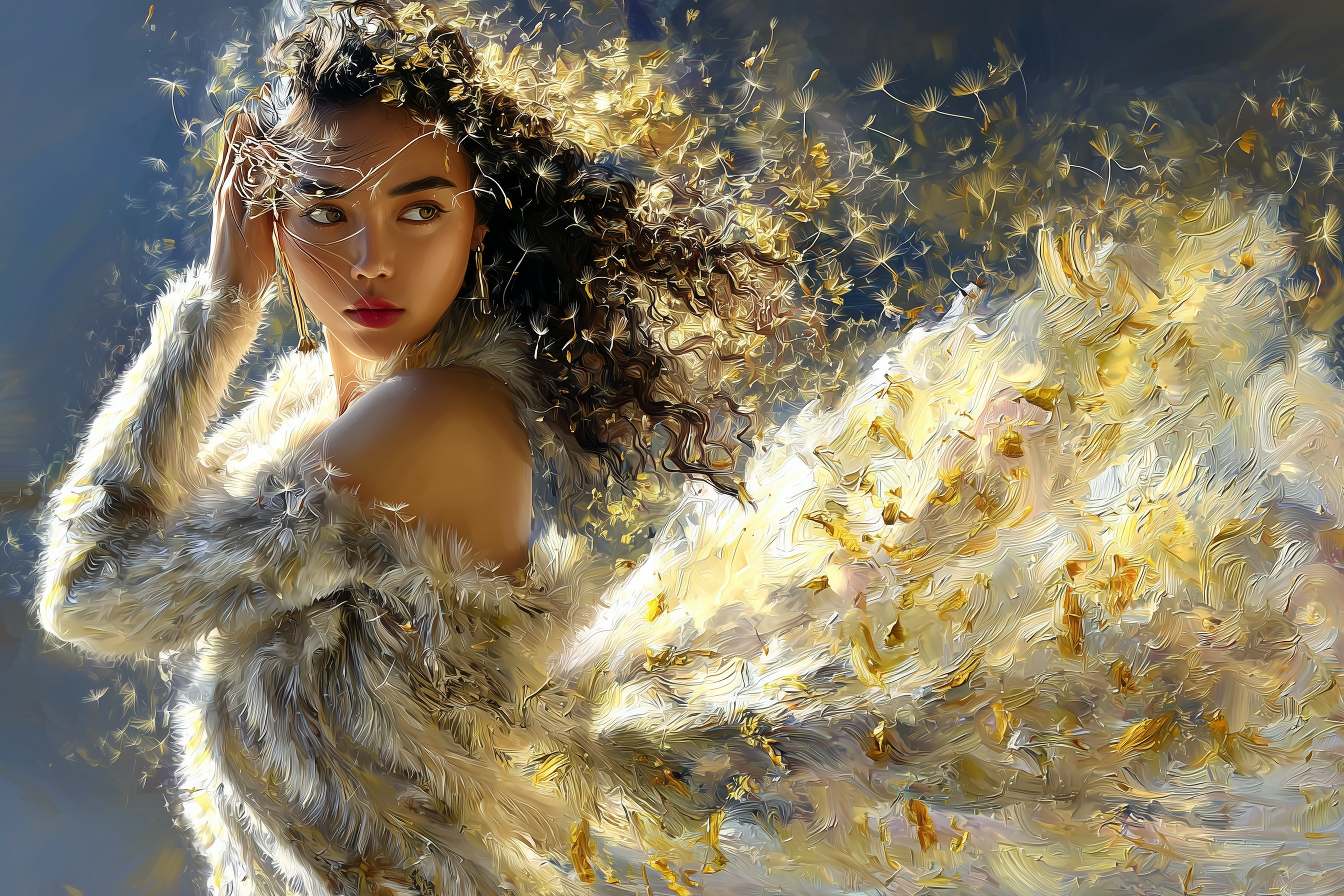 Create an encaustic 3d bas relief post-impressionist painting of a beautiful woman with long flowing curly black hair, turning back to look over her shoulder at the camera, wearing a stunning, white wolf-inspired gown with delicate, flowing design and intricate details resembling the fur and structure of a wolf, long, curly flowing hair cascading down her back, catching the light and adding a luminous quality to the image, background is soft and blurred, ethereal, V@n G0gh, hdr A realistic picture of a ballerina wearing a chiffon dress made from dandelions with more details and holding an umbrella made from dandelions and dancing under a rain of dandelions in a romantic realistic style with a background.